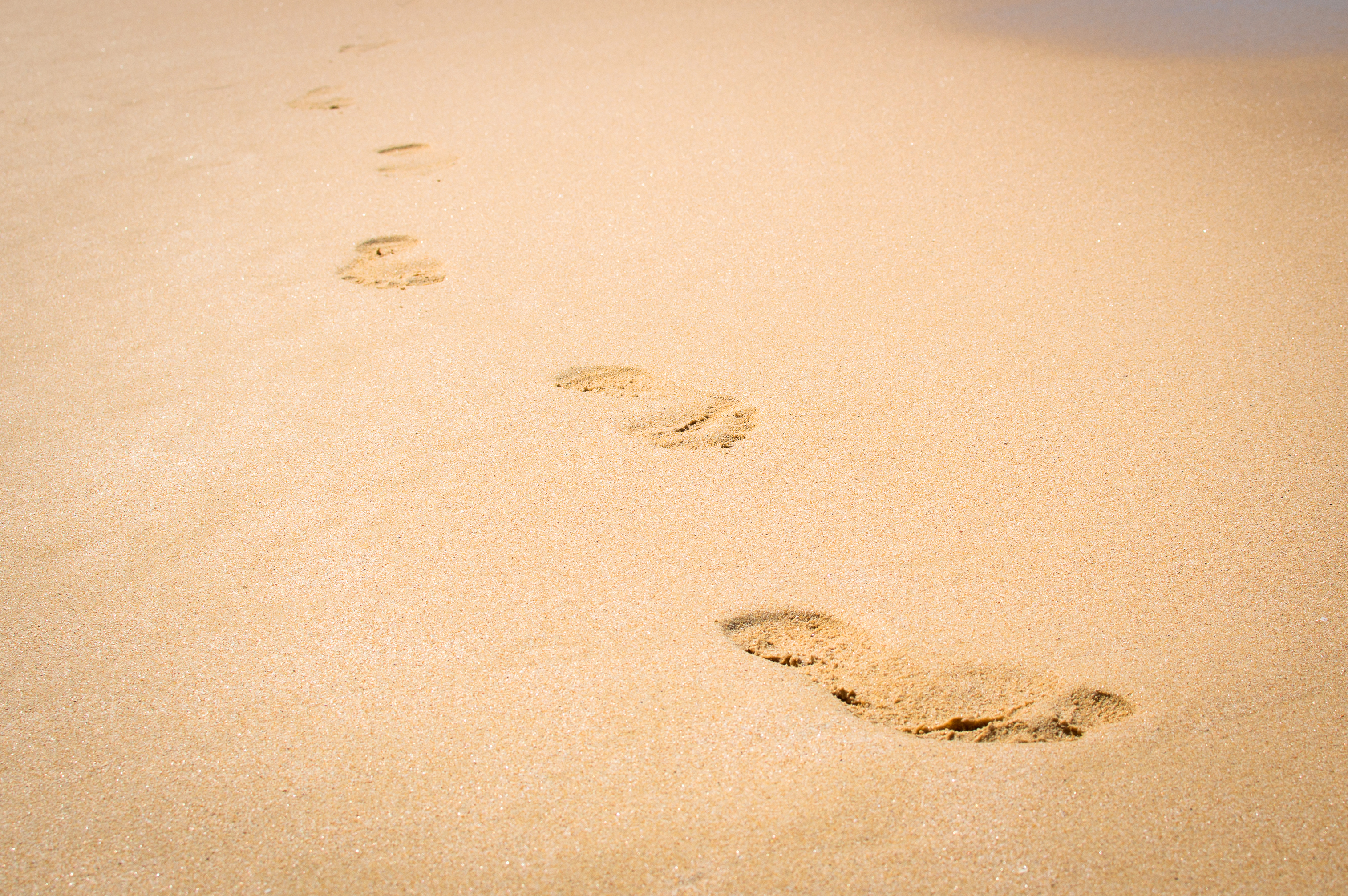 The image captures footprints on soft golden sand near the seaside. Shot on a sunny day, the light gently illuminates the sand surface, highlighting its texture and natural irregularities. The composition conveys a sense of movement and journey — the footprints recede into the distance, suggesting an ongoing path. The color palette is warm, dominated by sand tones and blue hues of the sea in the background. The sand texture is detailed, with individual grains visible, adding realism and depth to the image. The scene evokes tranquility and calmness, perfectly suited for themes of vacation, travel, and meditation.