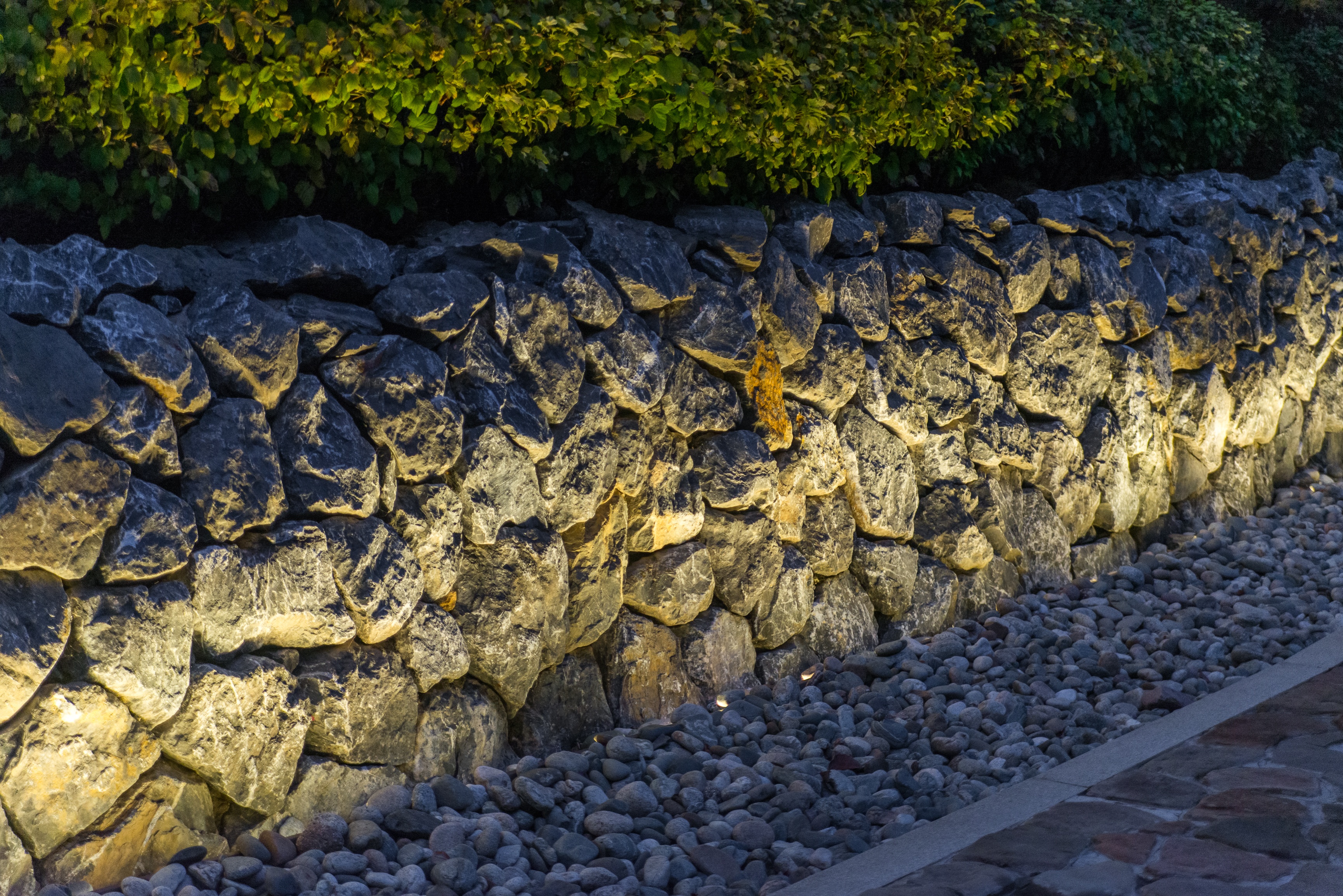 Подсвеченная каменная стена и сад