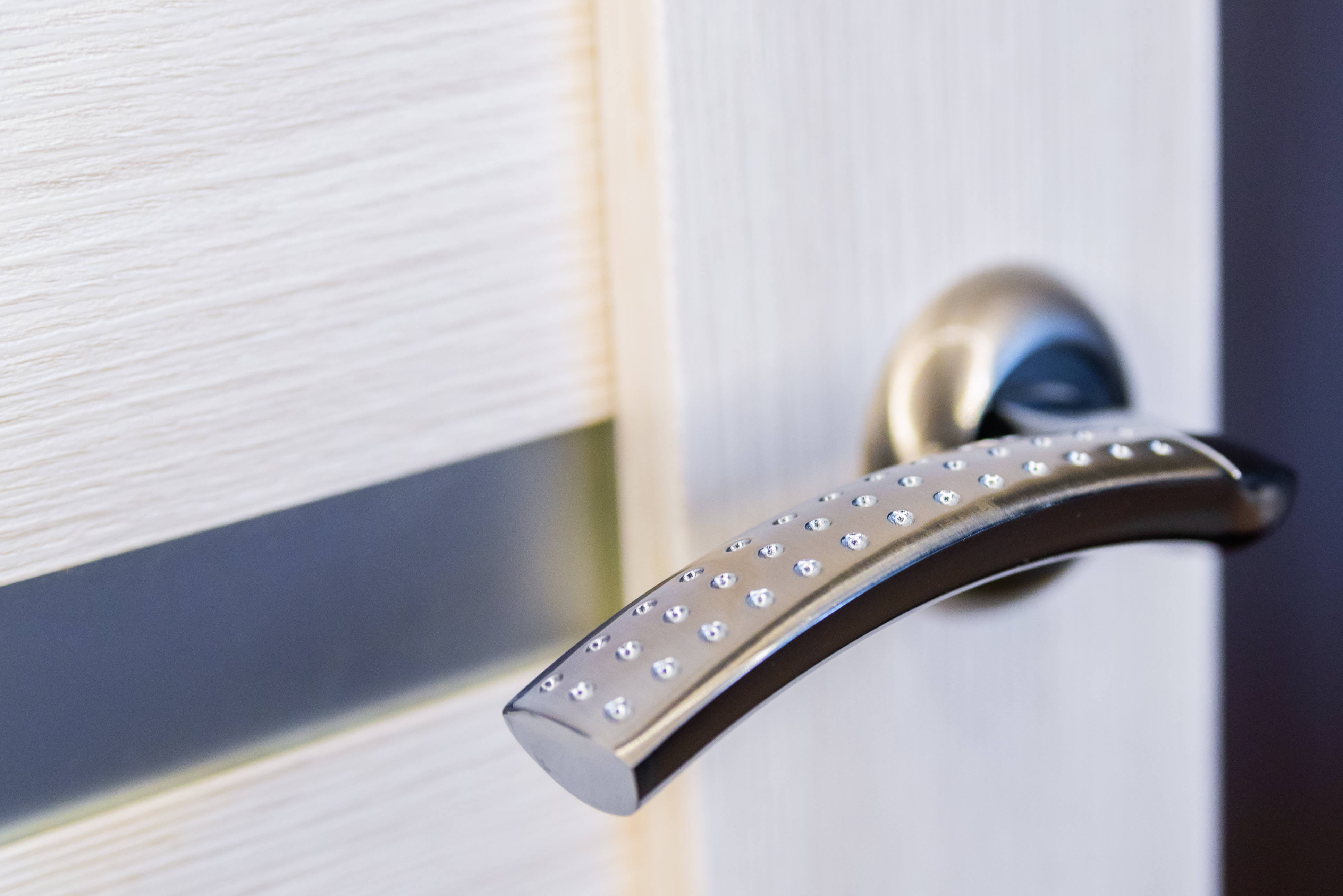The image features a modern minimalist door handle adorned with numerous small crystals, exuding luxury and elegance. The door itself has a textured surface with vertical stripes and a contrasting black insert, giving the composition a contemporary and refined look. Shot in close-up, the photograph allows for detailed observation of the smooth metallic surface of the handle, its reflective quality, and each individual crystal. The lighting is soft and directional, accentuating the form and texture of the materials. The background is slightly blurred, drawing the viewer's focus to the main subject — the handle. Such a photo is ideal for furniture catalogs, designer stores, interior advertising, and hardware promotion.