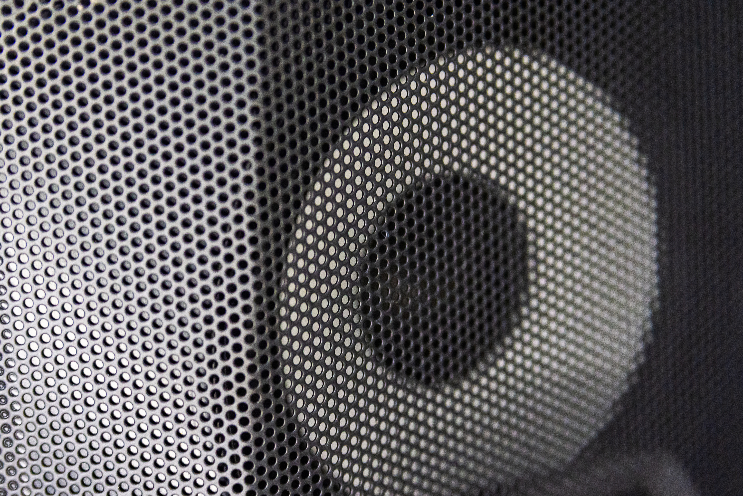 This macro shot captures a metallic speaker grille in minimalist style. The frame is focused on the geometric pattern formed by rows of small perforations, creating a rhythmic and structured visual effect. The central circular opening serves as an accent, adding symmetry and balance to the composition. The metal texture appears smooth but retains an industrial strength feel. Perfect for technical design projects, audio equipment advertising, or digital platform backgrounds. Shot with soft lighting to highlight fine details without harsh shadows. The style is modern, technological, and clean — making it versatile for various visual projects.