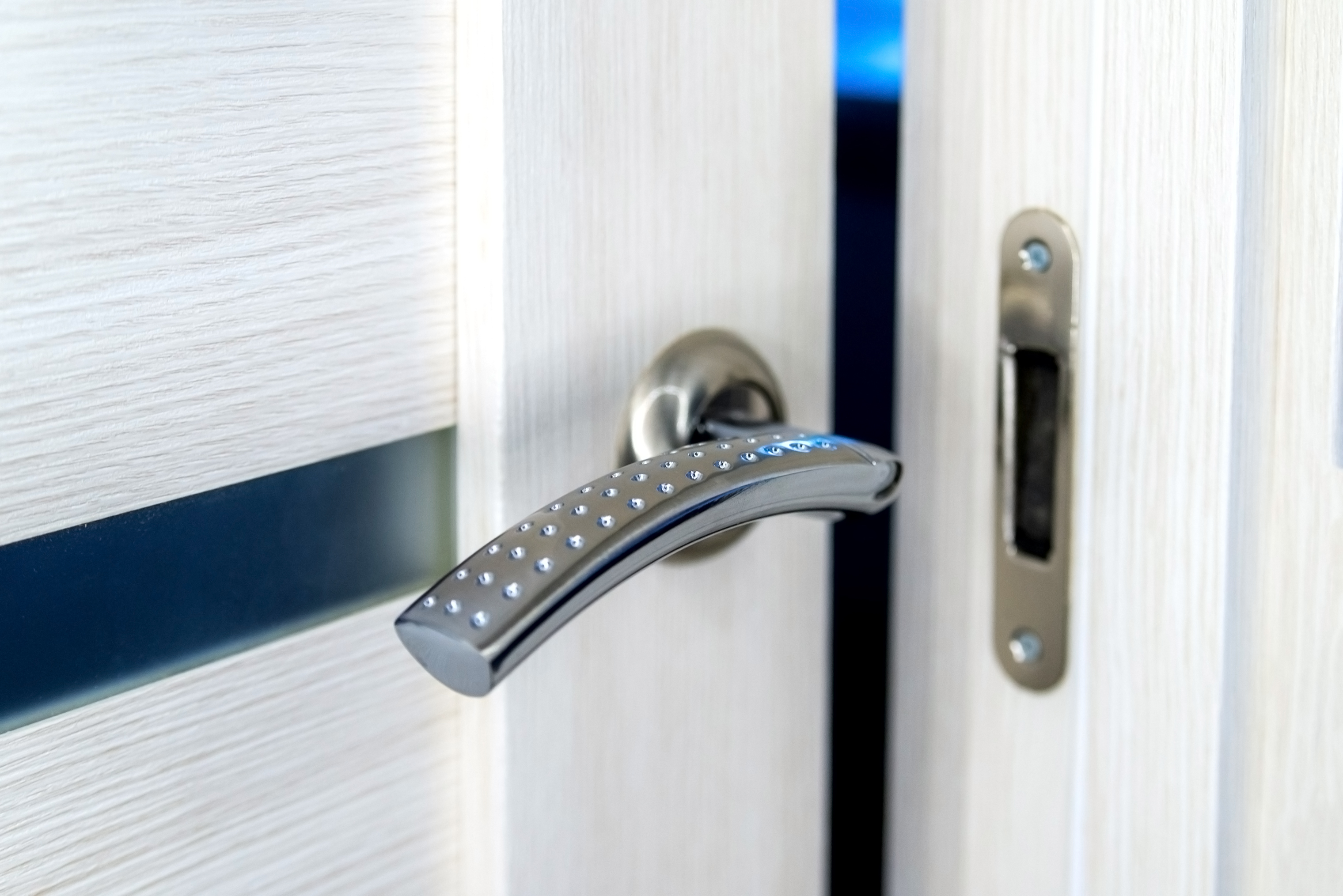 The composition details include a smooth, polished handle surface reflecting light, creating a sense of depth and volume. The LED diodes are arranged along the handle’s curve and emit a blue glow, adding a technological accent. The metallic lock mechanism has a matte finish and neat mounting screws. The door texture — vertical lines mimicking wood, with a dark accent stripe — gives the door a contemporary and stylish appearance. Lighting is soft with slight contrast, enabling detailed examination of all elements. The color palette — white, silver, and blue — evokes a sense of cleanliness and technological sophistication.