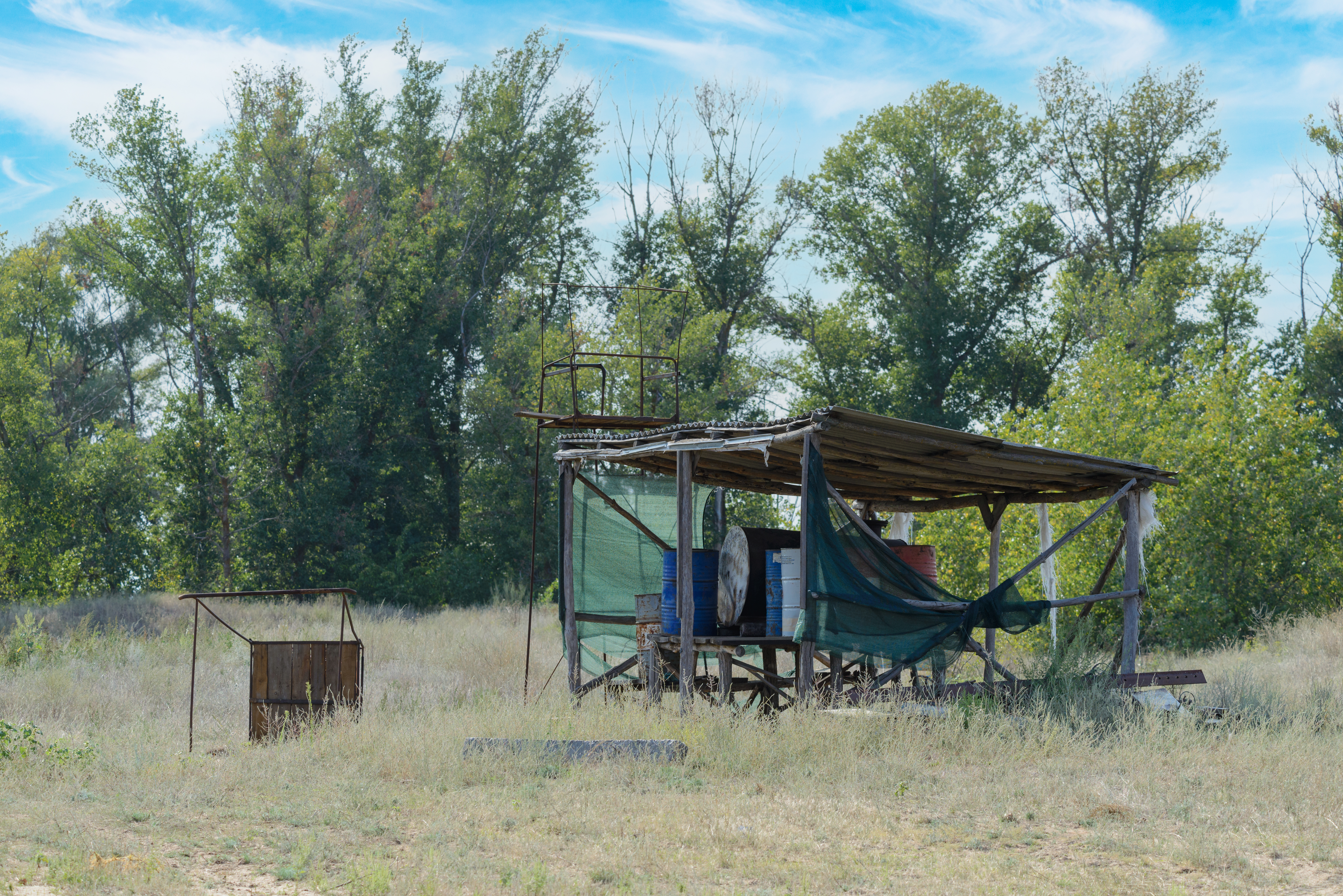 На фотографии изображена сельская местность в солнечный день, где на фоне густого леса и высокой сухой травы расположена деревянная хижина с зеленым навесом. Сцена передает ощущение уединения и простоты. Вокруг видны старые металлические конструкции, бочки и другие элементы, указывающие на временное использование пространства. Небо ярко-голубое, с легкими белыми облаками, что создает контраст с зелеными и коричневыми оттенками земли и растительности. Композиция сбалансирована: хижина находится в центре, а лесная линия создает глубину и перспективу. Освещение мягкое, рассеянное, что подчеркивает текстуры дерева, металла и травы. Общий вид передает атмосферу спокойствия, умиротворения и связи с природой. Это изображение идеально подойдет для иллюстраций, связанных с экологией, сельским хозяйством, туризмом, архитектурой и дизайном, а также для проектов, требующих аутентичного, необработанного вида сельской среды.