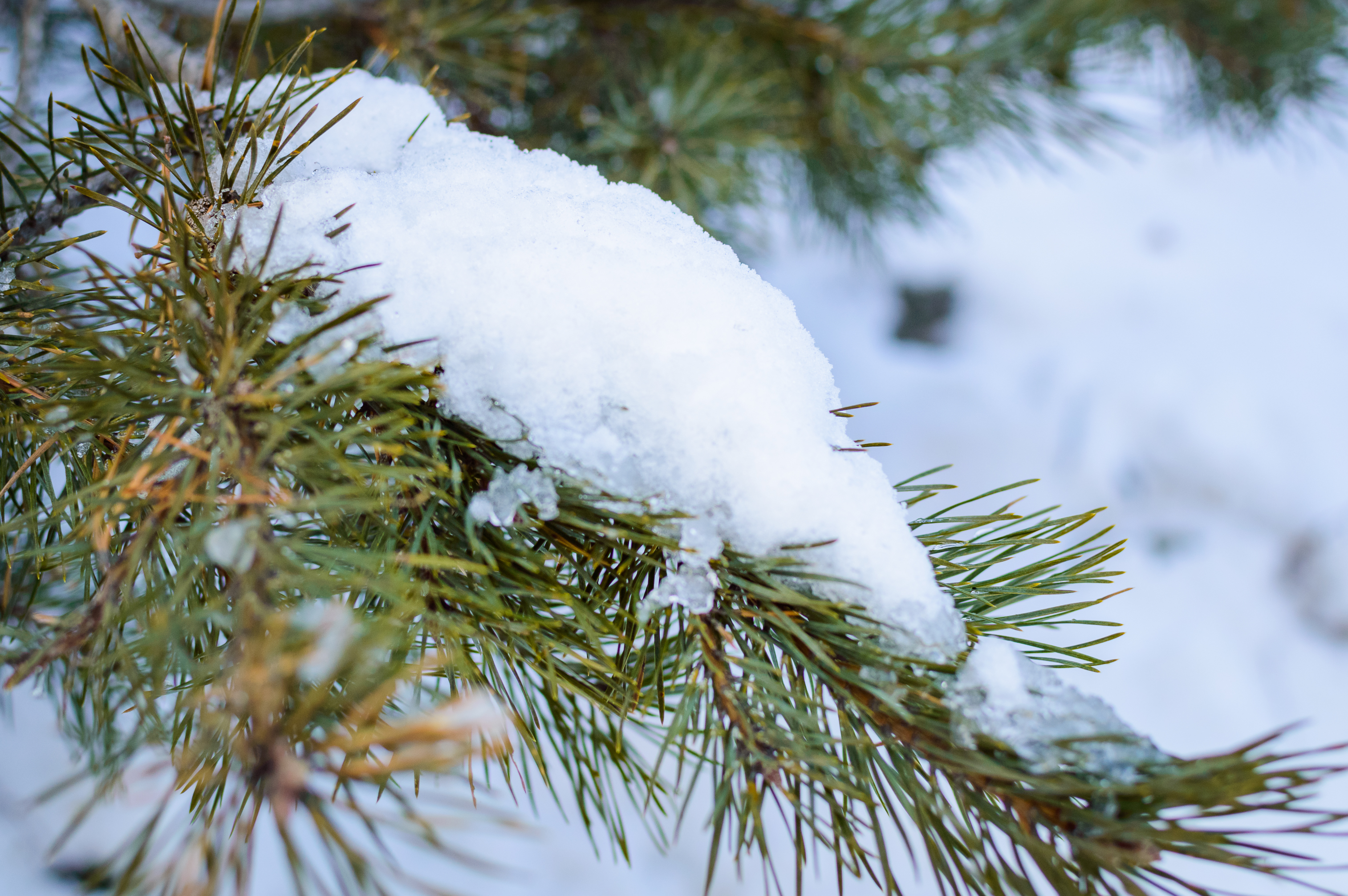 Snow-covered pine branch