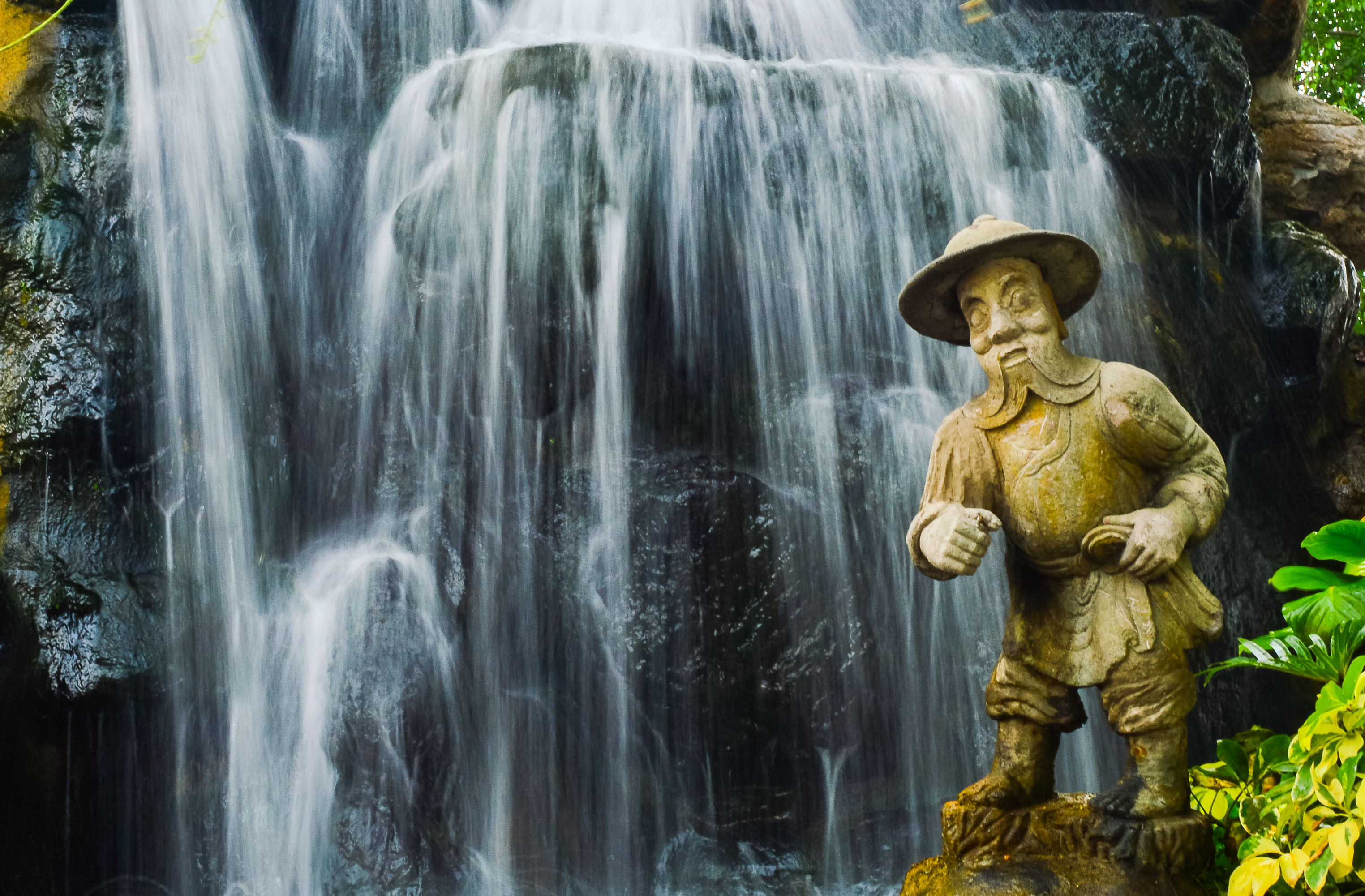 The image captures a picturesque waterfall cascading down, creating a sense of nature's power and dynamism. At the center of the composition is a stone statue depicting a man in a wide-brimmed hat, with a calm and contemplative expression. The statue stands on a rock, surrounded by greenery and trees, giving the scene a sense of harmony with nature. The background consists of dark rocks over which water flows, creating a contrast with bright green leaves and light streams. The lighting is soft and diffused, highlighting the texture of the stone and giving the scene a calming atmosphere. The composition is balanced: the statue occupies the right side of the frame, while the waterfall takes up the left, creating visual balance and drawing attention to both elements. The style of the image is realistic, with an emphasis on detail and the portrayal of natural beauty. The water appears smooth and flowing due to the use of a long exposure technique, giving the scene a dreamy, almost fairy-tale quality. Overall, the photograph conveys a sense of peace, tranquility, and harmony between art and nature, making it ideal for use in advertising, tourism, interior design, and other projects requiring the portrayal of calmness and natural beauty.