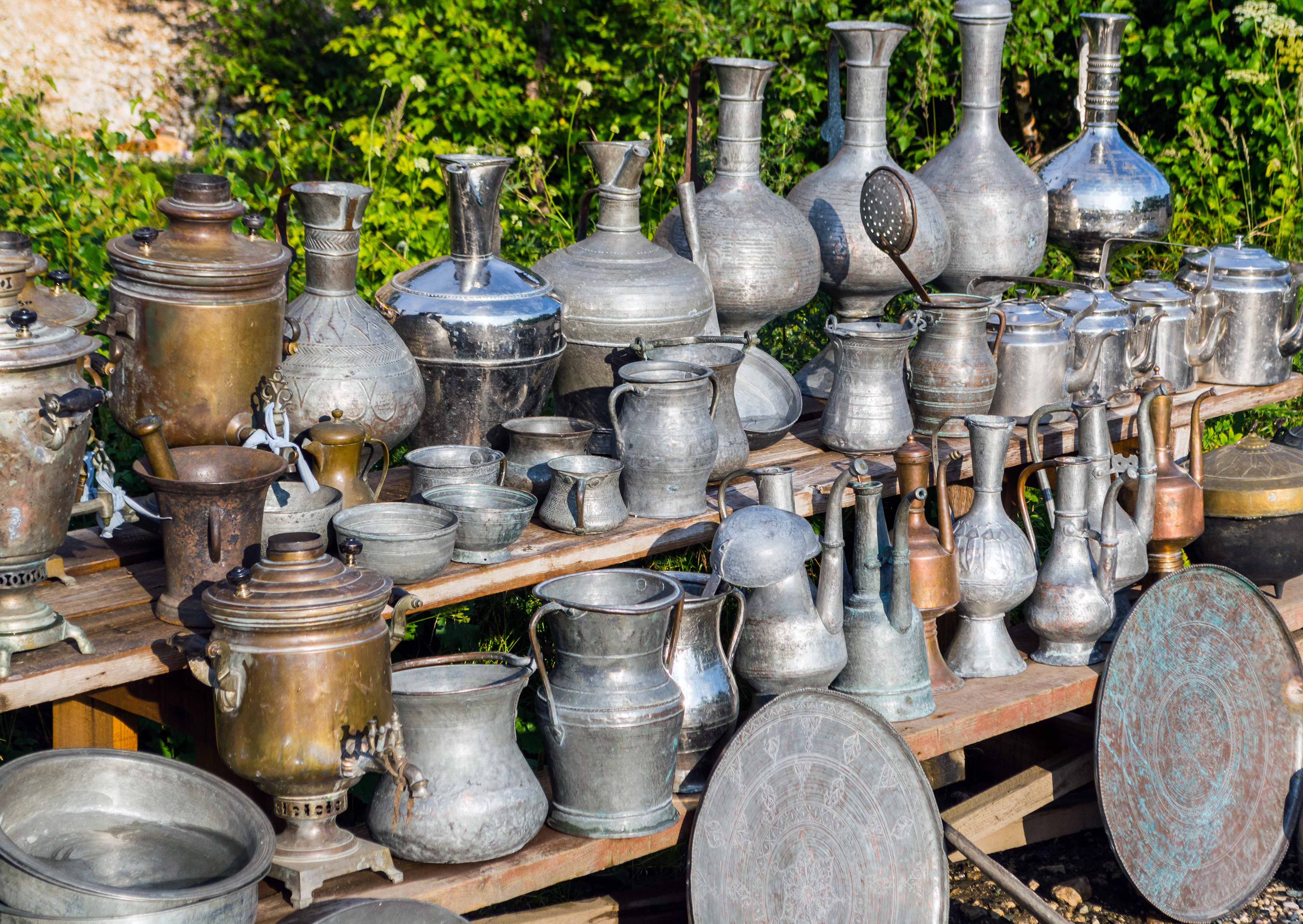 The image presents a vibrant and detailed scene featuring a variety of vintage metallic items arranged on a wooden cart. Jugs, teapots, bowls and other household objects are crafted in handmade styles and show signs of age — scratches, patinas and characteristic metal tones. The lush greenery in the background creates a contrast between the utilitarian nature of the objects and natural aesthetics. The composition is rich and dense — items are arranged in multiple rows, evoking a sense of abundance and historical value. Sunlight softly illuminates surfaces, highlighting textures of metal and relief patterns on some pieces. This scene is ideal for retro decor, antiques, cultural history and artisanal heritage projects. Visually, it conveys a sense of coziness, warmth and traditional home atmosphere where each item carries its own story and significance.