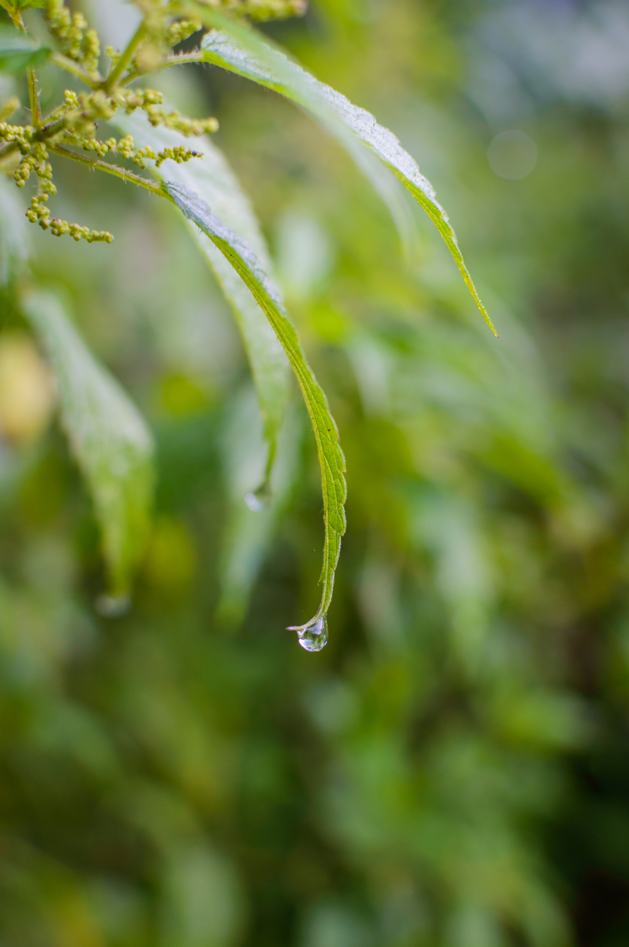 На фотографии представлен завораживающий крупный план зеленого листа, демонстрирующий невероятную красоту природы в мельчайших деталях. Лист, вероятно принадлежащий какому-либо кустарнику или дереву, занимает центральное место в кадре и привлекает внимание своей насыщенной зелёной окраской и выраженной текстурой. Свежесть листвы подчеркивается одиночной каплей воды, аккуратно покоящейся на его кончике. Капля, прозрачная как хрусталь, отражает окружающий свет, создавая миниатюрную линзу, через которую можно увидеть фрагменты размытого пейзажа за ним. Свет мягкий и рассеянный, что говорит о том, что снимок был сделан в пасмурную погоду или в тени листвы. Общий контекст изображения указывает на весенний или летний период, когда природа находится в зените своего развития и обильно снабжается влагой. Это момент тишины и созерцания, приглашающий зрителя остановиться и оценить хрупкость и великолепие мира природы.