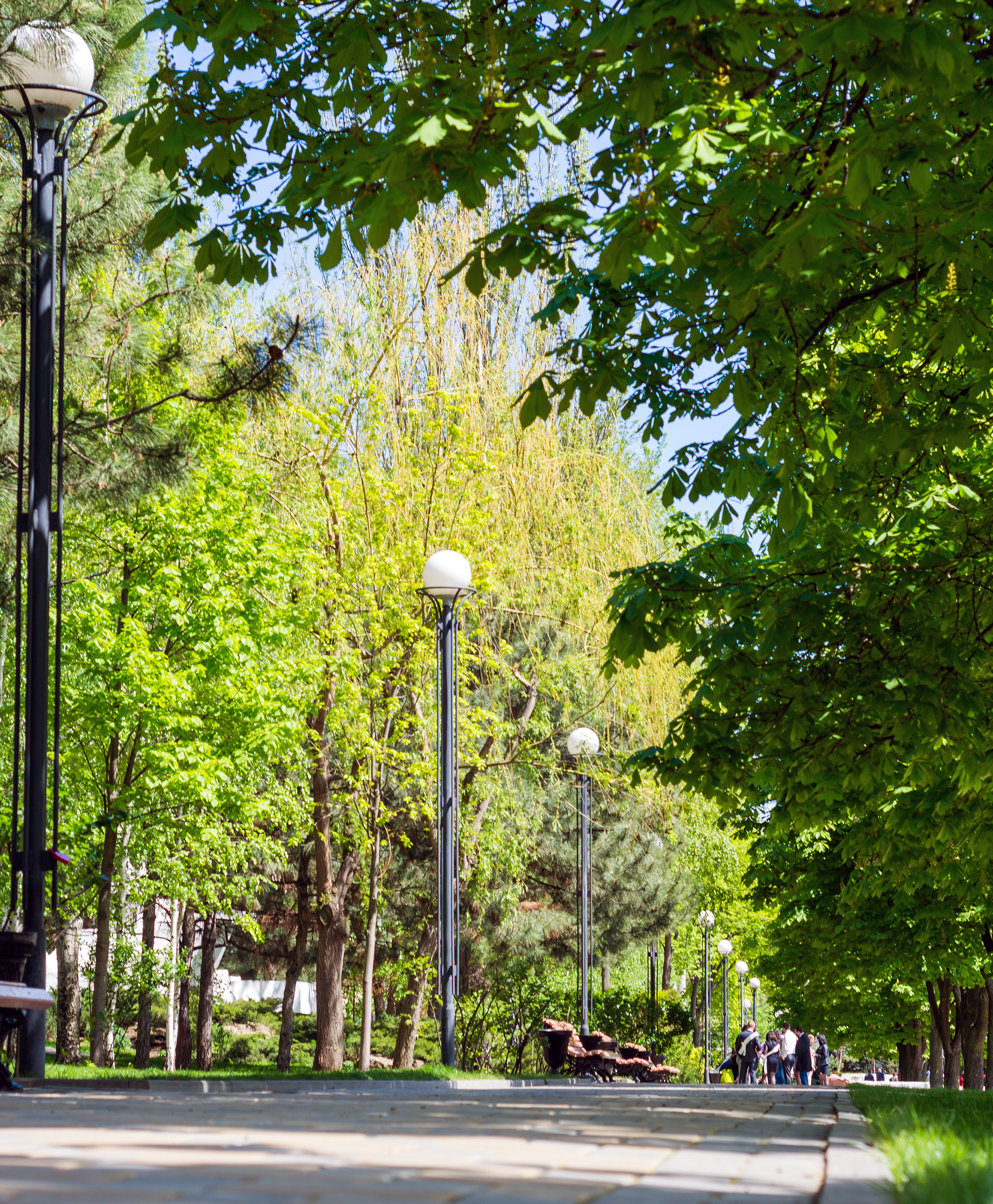 Это изображение представляет собой умиротворяющую аллею, простирающуюся вдоль широкой пешеходной дорожки, усыпанной мягким мраморным покрытием, которое отражает тёплый свет старинных фонарей. Дорожка ведёт вглубь парка, где деревья с густой кроной образуют естественную арку, создавая ощущение уединённого перехода между светом и тенью. Вечернее освещение придаёт сцене магическую атмосферу — свет фонарей мягко проникает сквозь листья, создавая игру теней и бликов на дорожке, а воздух кажется наполненным прохладой и ароматом свежей зелени. Вдали виднеются силуэты садовых скамеек и небольших декоративных фонтанов, которые добавляют уюта и умиротворения. Место расположено в благоустроенном парке, возможно, в историческом районе города, где архитектура и природа гармонично сочетаются. Время съёмки — вечер, когда солнце уже скрылось за горизонтом, но фонари ещё не потухли, оставляя на сцене мягкое, романтичное освещение, которое подчеркивает текстуру коры деревьев и зелень листьев. Композиция симметрична, с центральной осью, ведущей взгляд зрителя вглубь кадра, где перспектива сужается, усиливая ощущение глубины и движения вперёд.