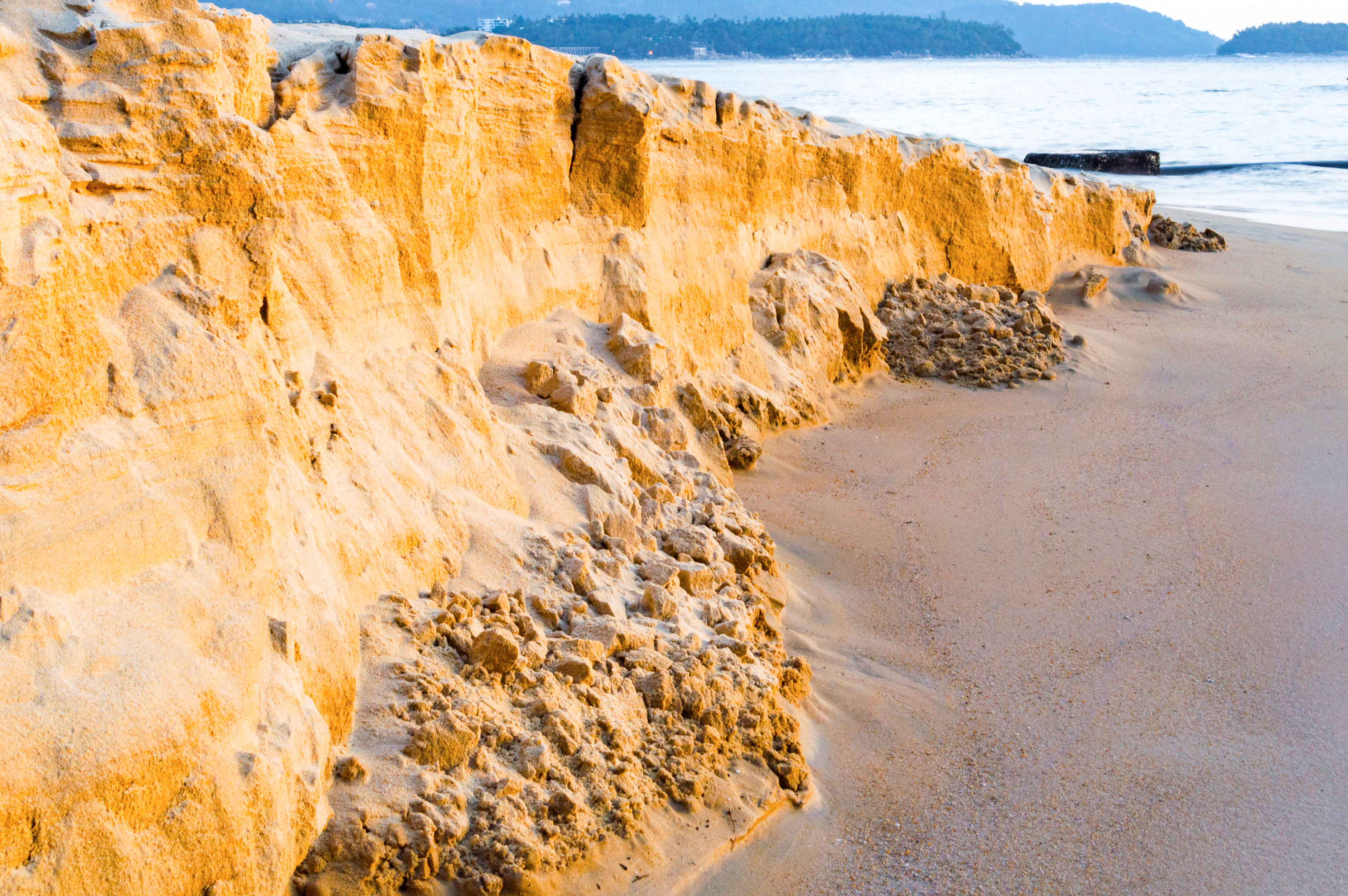 This captivating image showcases the stunning golden sand cliffs of a coastal beach, dramatically eroded by the ocean's relentless force. The scene unfolds during the golden hour, when the low sun casts a warm amber glow across the textured surfaces of the dunes and cliff faces. In the distance, calm ocean waters stretch to meet a faint horizon line framed by hazy hills covered in greenery. The composition draws attention to the intricate details of natural erosion: layered sandstone formations with sharp ridges, soft undulations, and pockets of compacted sand. The contrast between the rugged, weathered cliffs on one side and the smooth, untouched beach on the other creates a powerful visual narrative about time and nature's persistent sculpting.