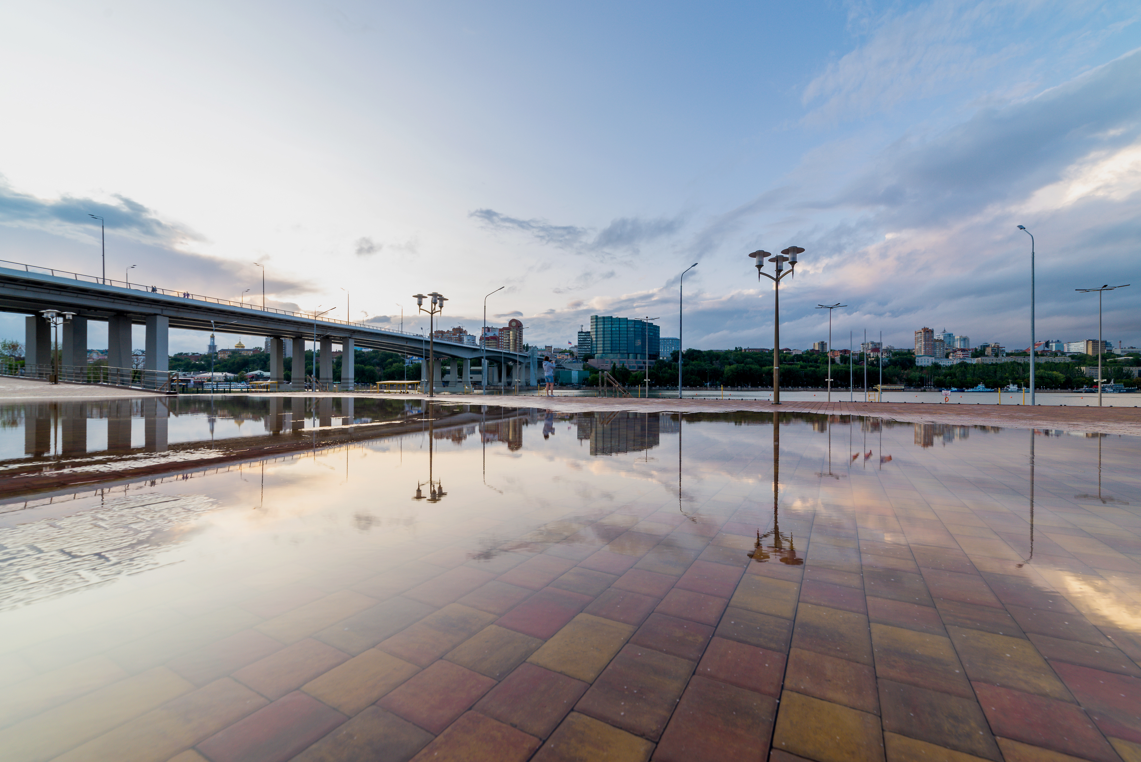 This captivating image presents a tranquil urban riverside walkway at dusk, where the stillness of a large puddle creates a perfect mirror reflecting a modern concrete bridge and the soft hues of the evening sky. The scene is set on an expansive tiled pavement that leads the viewer’s eye toward the horizon, framed by distant city buildings under a partly cloudy twilight. The composition employs strong horizontal lines from the bridge, walkway, and reflected skyline to create a sense of calm order and balance. Street lamps stand like silent sentinels along the path, their reflections elongated in the water, adding depth and symmetry to the frame.
