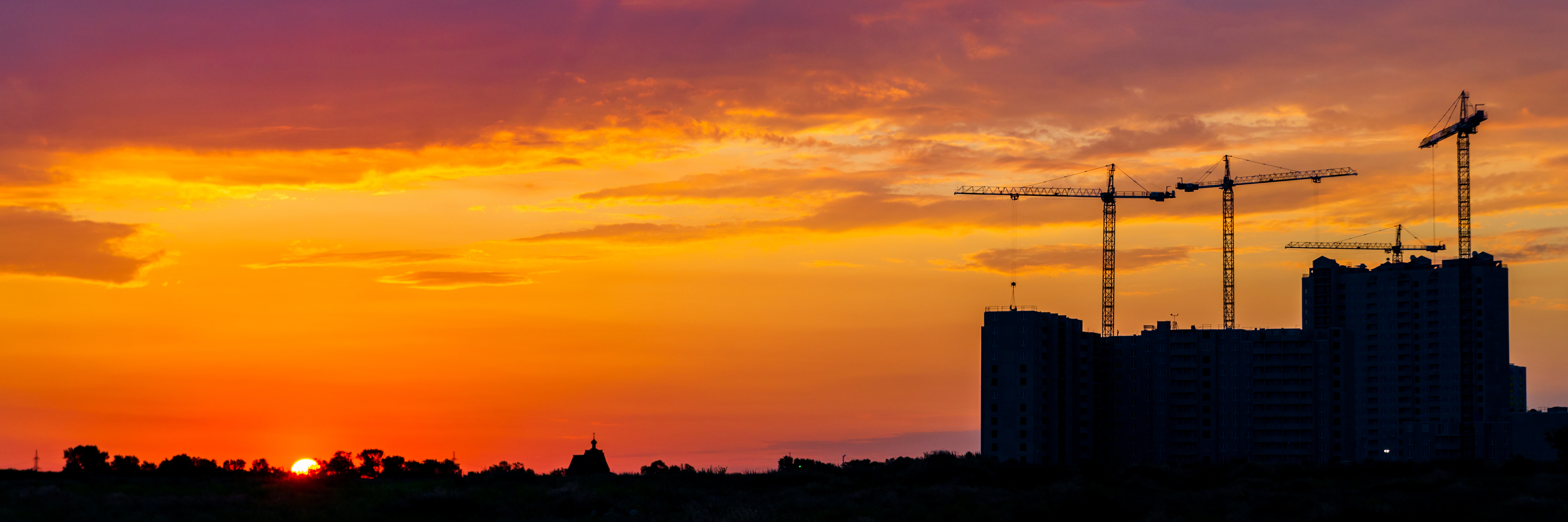 Это захватывающее изображение представляет собой строительную площадку жилого дома, окутанную теплым сиянием заката. Небо превращается в великолепный холст, расписанный ярко-оранжевыми, золотистыми и глубокими фиолетовыми облаками, протянувшимися по горизонту. На фоне этого живописного пейзажа доминируют силуэты нескольких высоких кранов, символизирующих неуклонное развитие города. Ниже, на темных контурах незавершенных многоэтажных зданий возвышаются архитектурные формы, едва различимые под драматическим освещением. В нижней части кадра плотная линия деревьев создает фрейм для композиции, придавая сцене устойчивость и контраст с вертикальными конструкциями выше. Фотография запечатлела момент, когда красота природы встречается с человеческим стремлением к прогрессу, создавая мощный визуальный метафорический образ.
