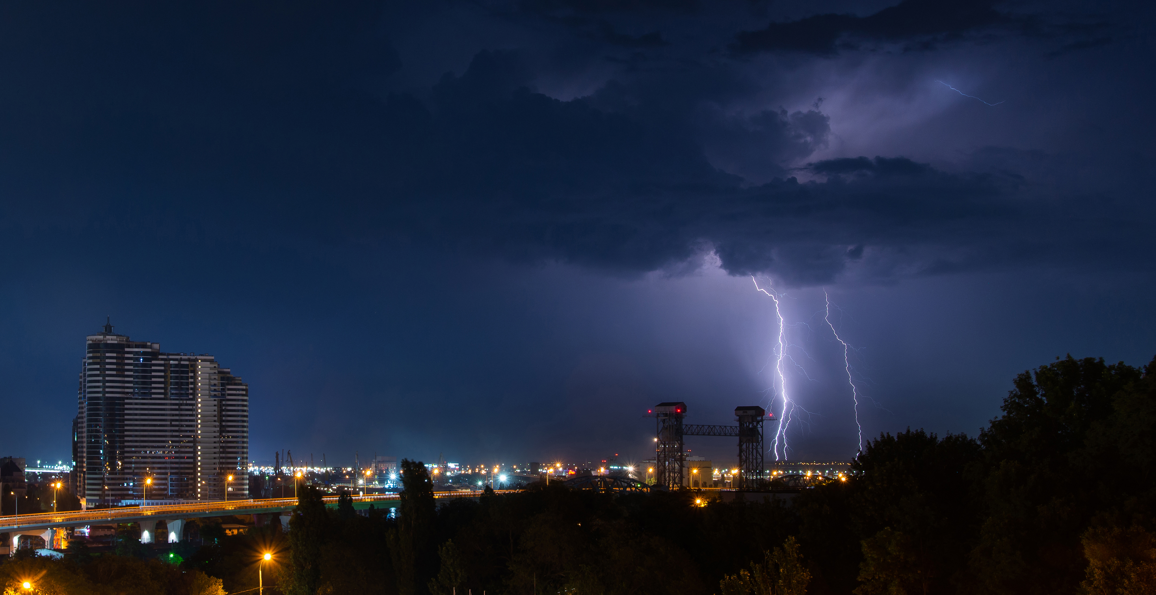 На изображении запечатлен мощный и драматичный шторм, охвативший небо в глубокую полночную тьму. В центре композиции — яркая, раздвоенная молния, прорезающая черноту, словно ножом в ткань ночи. Ее свет озаряет облака, превращая их в гигантские, пульсирующие формы, наполненные электрическим зарядом. Гром, хотя и не видим, ощущается в напряженной атмосфере — звук, как будто сотрясающий землю, оставляет ощущение близости и угрозы. Небо насыщено оттенками серого, синего и фиолетового, с переливами желтого и белого от молнии, создавая контраст, который напоминает живописный кадр из природного фэнтези. Внизу, хотя и не видно, можно представить силуэт земли, окутанной туманом или дождем, что усиливает ощущение изоляции и величия природы.