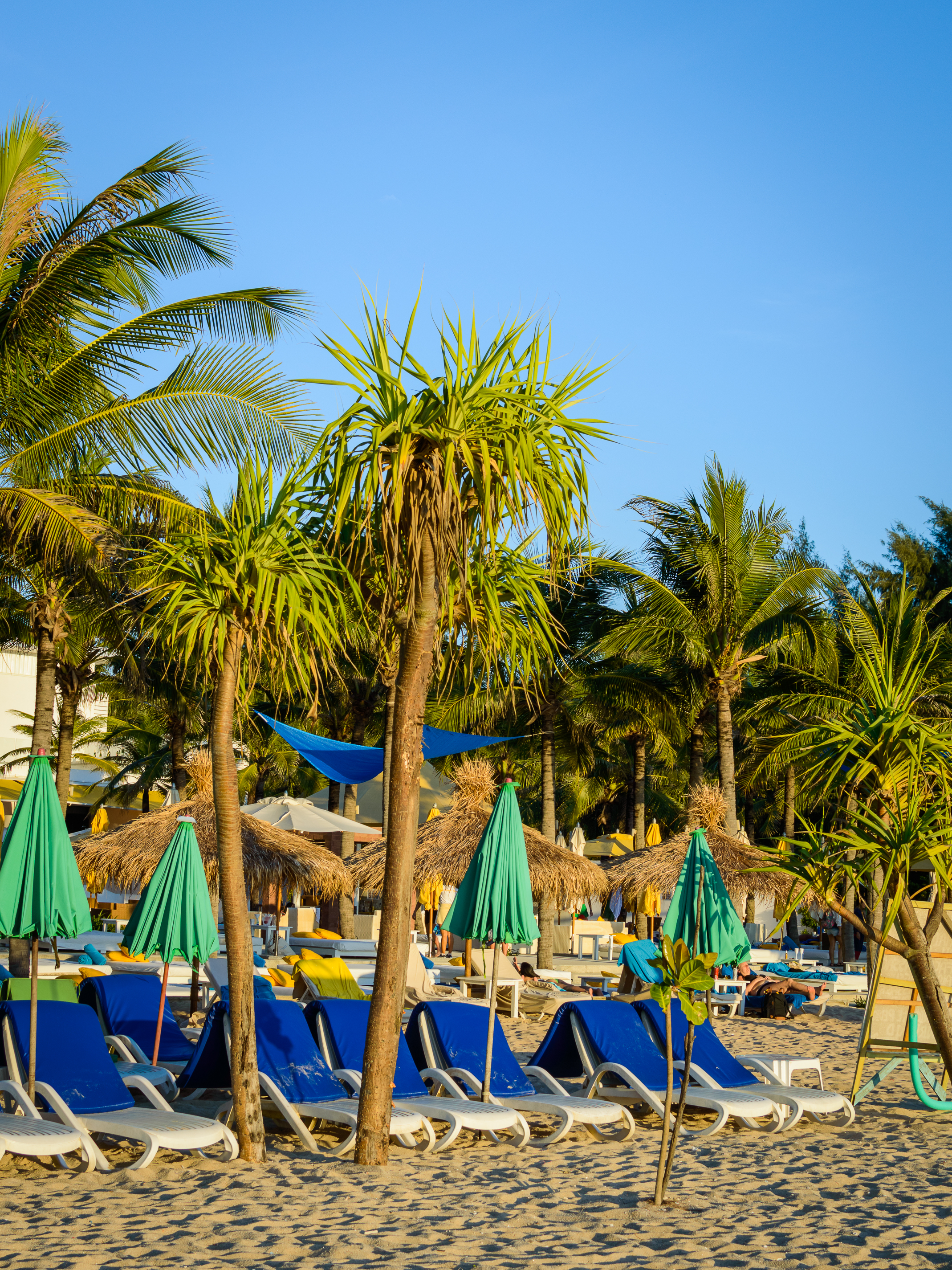 Это захватывающее изображение передаёт суть тропического пляжного курорта во время летнего сезона. Сцена разворачивается под обширным безоблачным голубым небом, которое бесконечно простиралось над золотистым песчаным берегом. Высокие пальмы с густой зелёной кроной слегка колышутся на тёплом ветре, создавая естественные навесы над рядами приглашающих синих шезлонгов и соответствующих зелёных зонтов. Эти аккуратно расположенные солнечные лежаки предназначены для максимального отдыха, направлены на невидимую горизонталь океана. На заднем плане растительные кабанки из натуральной соломы добавляют тропический шарм современной инфраструктуры курорта. Солнечный свет окутывает всё в тёплые золотистые тона, бросая мягкие тени на песок и подчёркивая яркие цвета мебели и растительности. Композиция сбалансирована — стволы пальм выступают как вертикальные элементы против горизонтальных линий пляжа и горизонта, создавая приятный визуальный ритм.