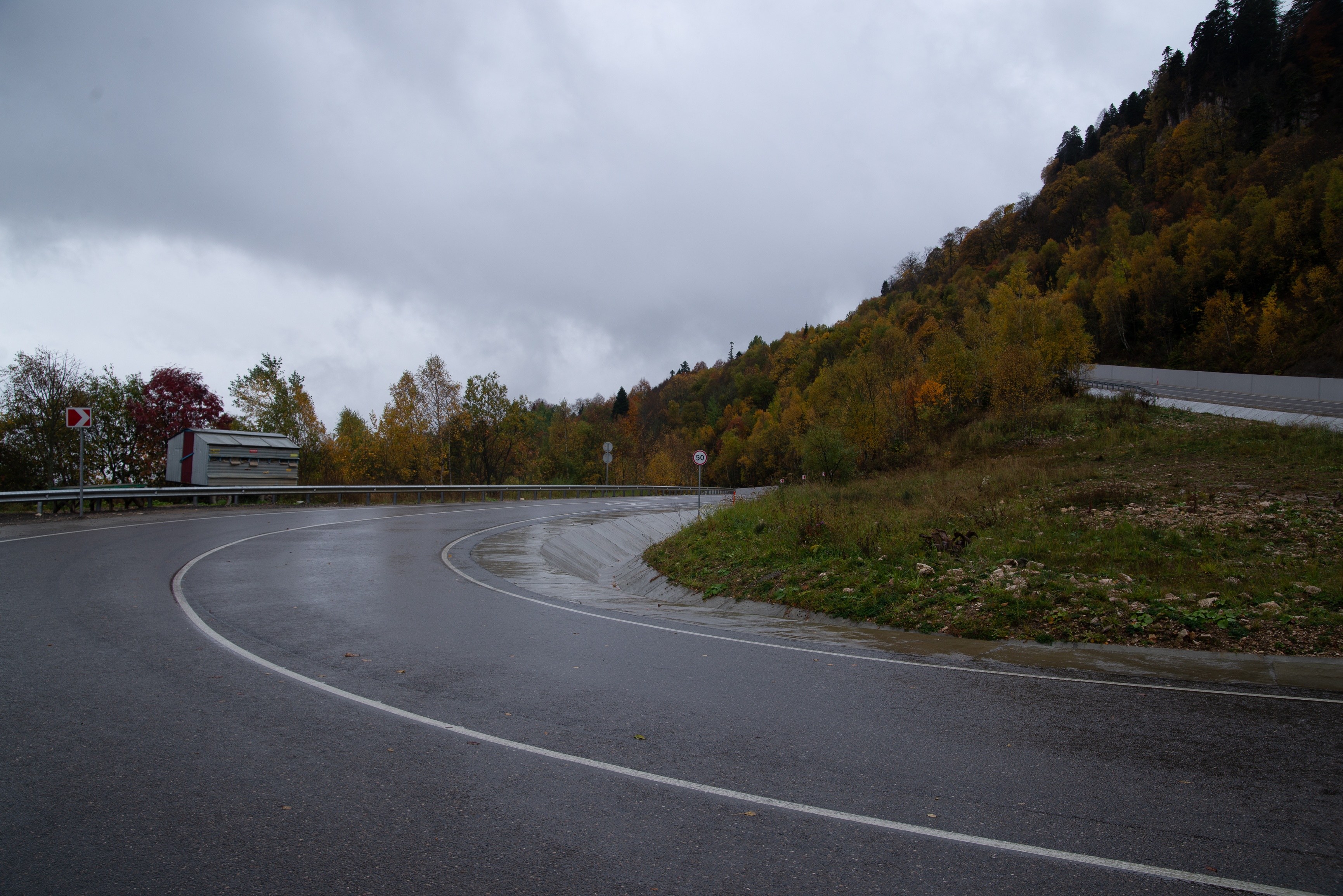 The image shows a winding, wet asphalt road curving through an autumn forest on a cloudy day in Adygea. The road meanders into the distance, evoking a sense of motion and perspective. Both sides are bordered by hills covered with trees displaying vibrant autumn foliage — shades of yellow, orange, and red — contrasting against the gray sky. On the left, a road sign and metal guardrail add elements of human infrastructure to the natural landscape. The road’s surface glistens with moisture, reflecting the sky and trees, enhancing the feeling of freshness and coolness.