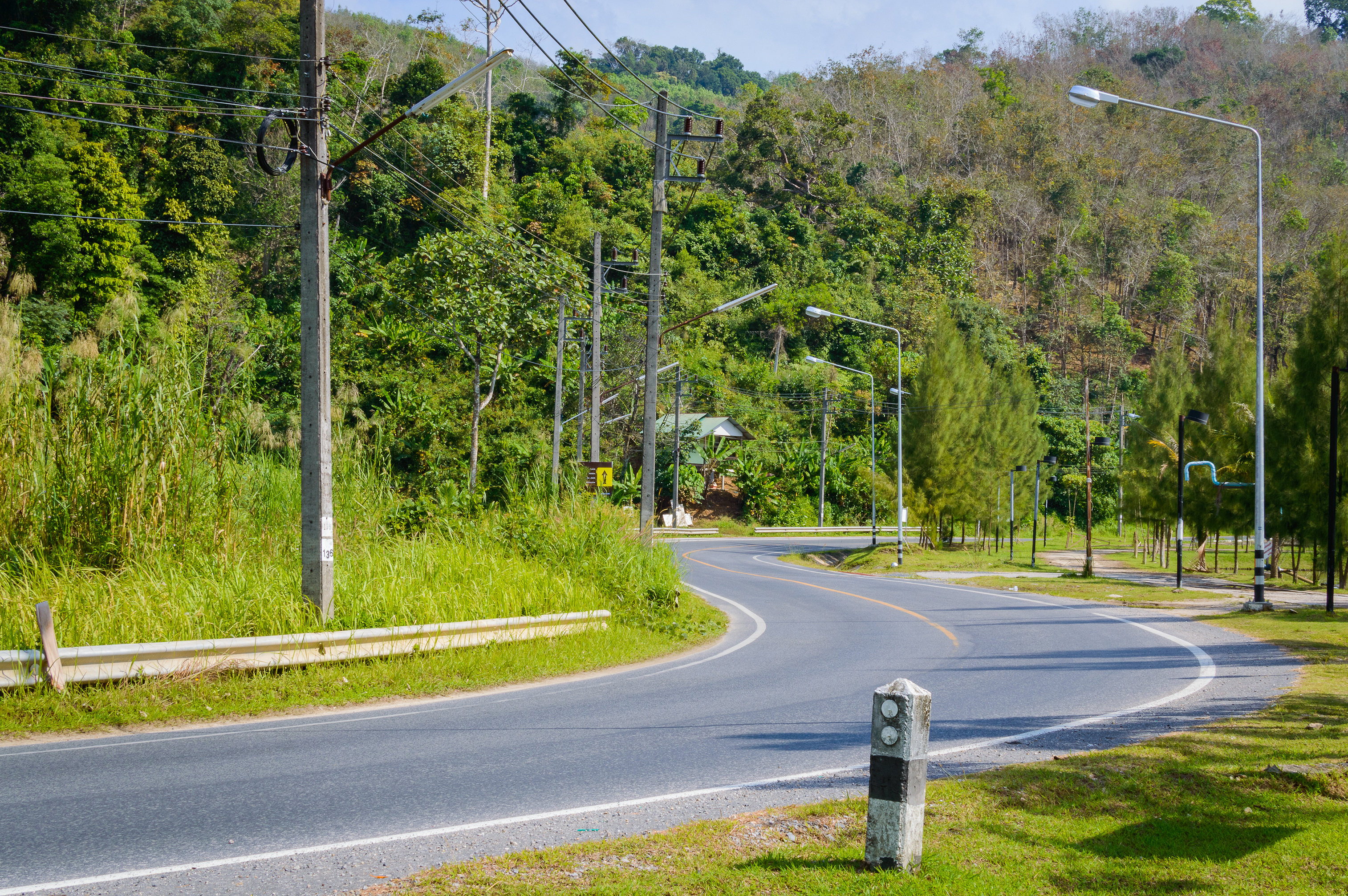 This captivating image portrays a gently curving asphalt road that winds its way through an expansive, verdant tropical forest. The scene is bathed in the warm, golden glow of midday sunlight filtering through dense tree canopies, casting intricate patterns of light and shadow across the pavement and surrounding grassy verges. Modern streetlights with sleek metallic poles are strategically placed along both sides of the road, their clean lines contrasting subtly with the organic shapes of towering trees and thick undergrowth. Utility poles stand sentinel alongside the path, carrying overhead wires that hint at human presence without disrupting the natural harmony. A small roadside marker with black-and-white stripes stands prominently in the foreground, drawing attention to the curve ahead. The background reveals a gently sloping hillside densely covered in emerald foliage, stretching toward a clear, cloudless sky that enhances the sense of openness and tranquility. This landscape photograph captures the perfect balance between nature's wild beauty and the quiet infrastructure of rural development, inviting viewers to imagine embarking on a peaceful drive through this secluded paradise.