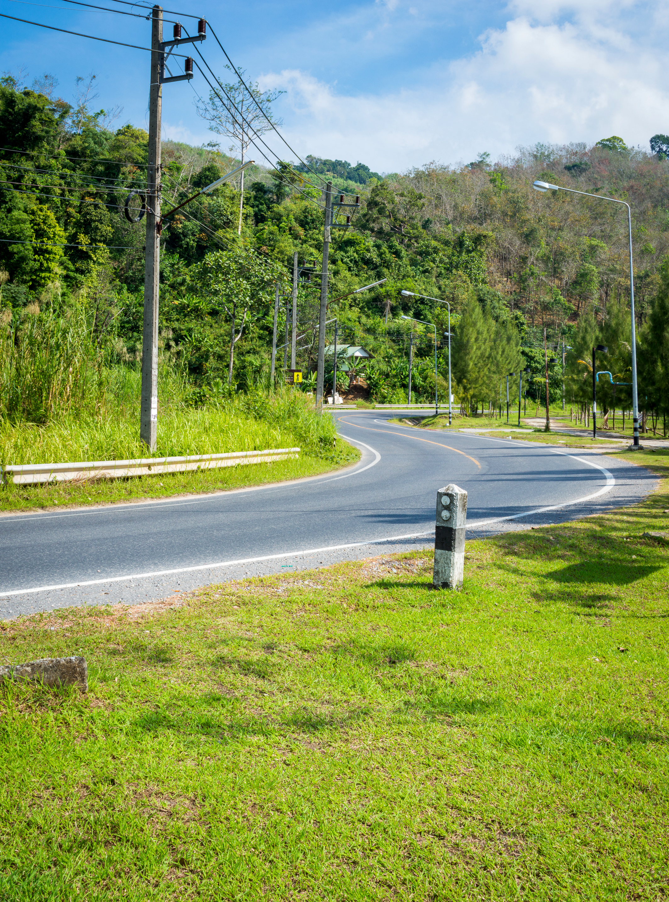 This captivating image portrays a winding asphalt road gracefully curving through an expansive lush green forest, framed by a vibrant blue sky with soft white clouds. The scene is set in a tranquil rural environment during bright daytime hours, where the natural beauty of the landscape takes center stage. Street lamps and utility poles are strategically placed along both sides of the road, adding subtle human elements to the otherwise untouched nature setting. A distinctive road marker stands prominently on the grassy verge near the curve, serving as a visual anchor point in the composition. The surrounding vegetation is dense with tall trees and thick underbrush, creating a verdant canopy that enhances the sense of seclusion and peace.
