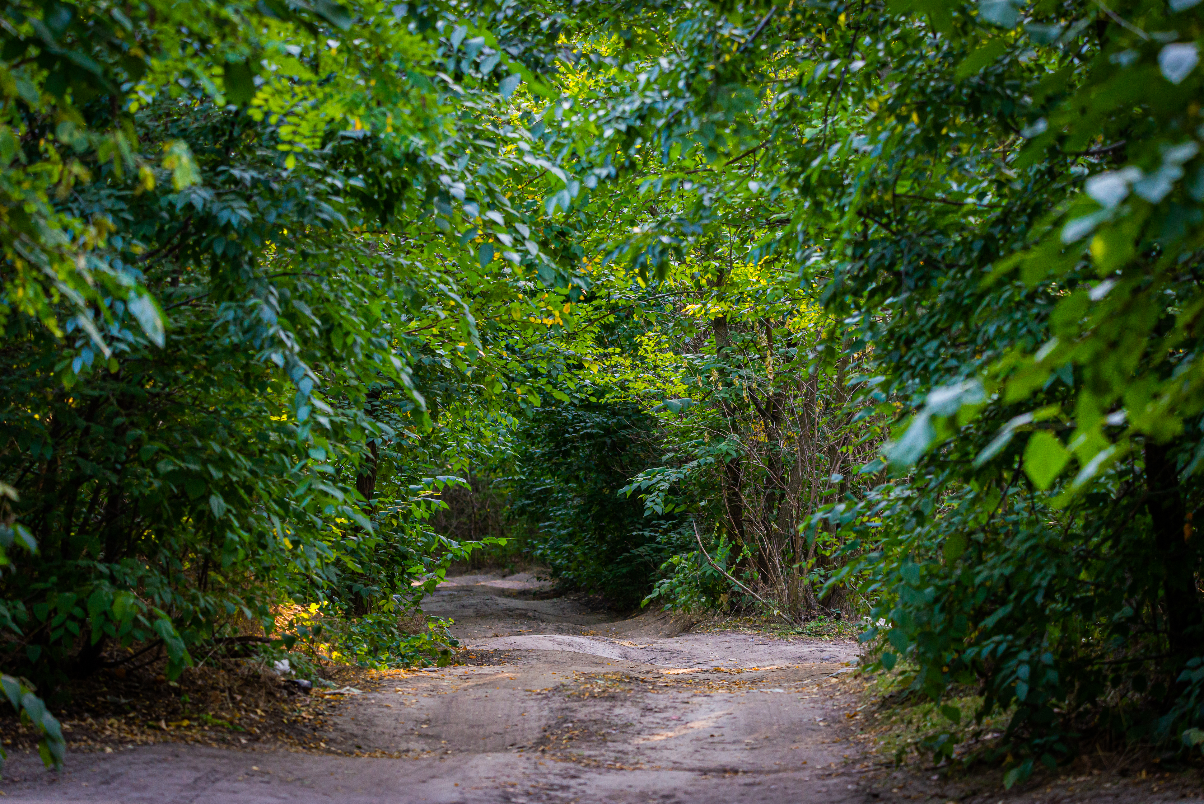 Грунтовая дорога, пронзённая солнечными лучами, ведёт сквозь густой лес, где деревья с мощными стволами и густой кроной образуют естественный свод над тропой. Дорога, покрытая мелкими камнями, землёй и сухими листьями, извивается между деревьями, словно приглашая путешественника вглубь необъятного лесного пространства. Вдали виднеются силуэты деревьев, теряющихся в туманной дали, что создаёт ощущение бесконечности и уединения. Время суток — раннее утро или поздний вечер, когда солнце наклоняется, окрашивая стволы деревьев в золотистые и бронзовые оттенки, а тени на земле становятся мягкими и растянутыми. Воздух кажется прохладным и прозрачным, наполненным ароматом хвои и влажной земли. Контраст между тёмными стволами и светлыми пятнами, пробивающимися сквозь листву, создаёт динамичный и живой ритм композиции.