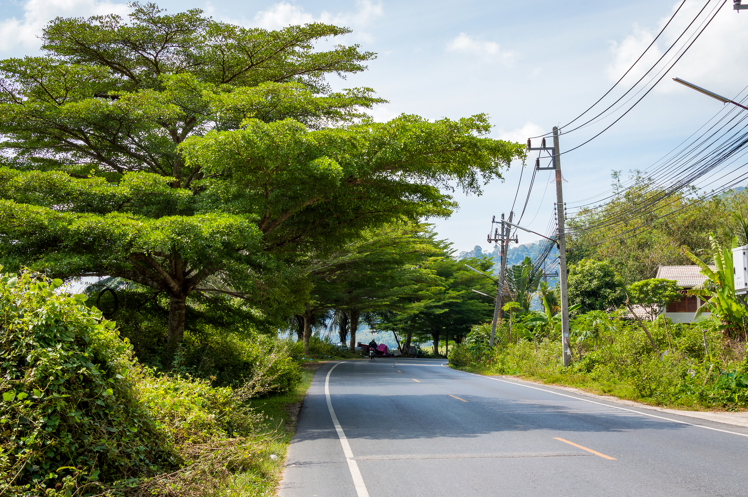 The photograph is composed with strong leading lines created by the road’s gentle curve disappearing into the distance, drawing the viewer’s eye toward a faint horizon where more trees and possibly distant hills are visible. The color palette is dominated by rich emerald greens of the leaves contrasting beautifully against the dark gray asphalt and the pale blue sky. Textures range from the rough bark of mature trees to the smooth surface of the road, with sunlight creating sharp highlights on leaves and soft shadows beneath them. A single motorbike can be seen far ahead, adding a sense of scale and movement while maintaining the overall quietness of the scene.