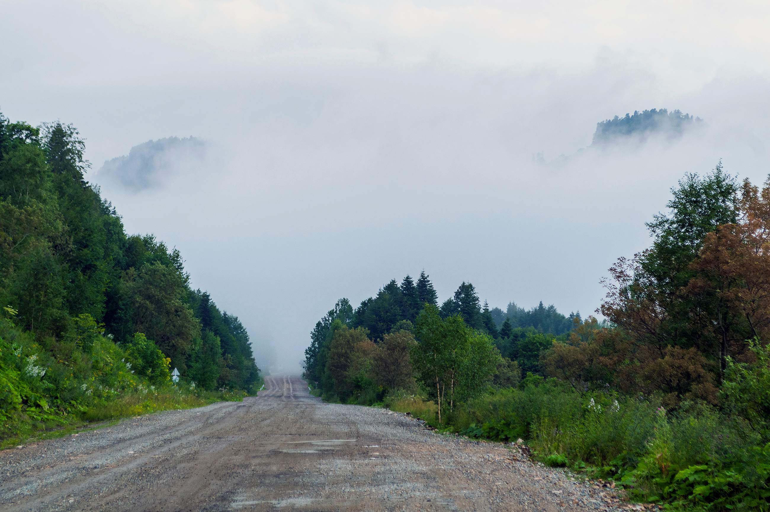This captivating image captures a gravel road vanishing into the clouds, winding through a dense forest that blankets both sides. The scene is enveloped in thick fog, obscuring distant mountain peaks and creating an ethereal, almost otherworldly atmosphere. The sky above is overcast with soft gray tones, casting diffused light across the landscape without harsh shadows. Trees of varying green hues dominate the foreground and middle ground, their leaves appearing lush yet slightly damp from moisture in the air. A few trees on the right show hints of autumnal colors, adding subtle contrast to the dominant greens. The road itself is uneven, composed of compacted gravel and dirt, with faint tire tracks visible as it recedes into the fog. This composition evokes a sense of solitude and quiet adventure, inviting viewers to imagine traveling deeper into this mysterious realm.