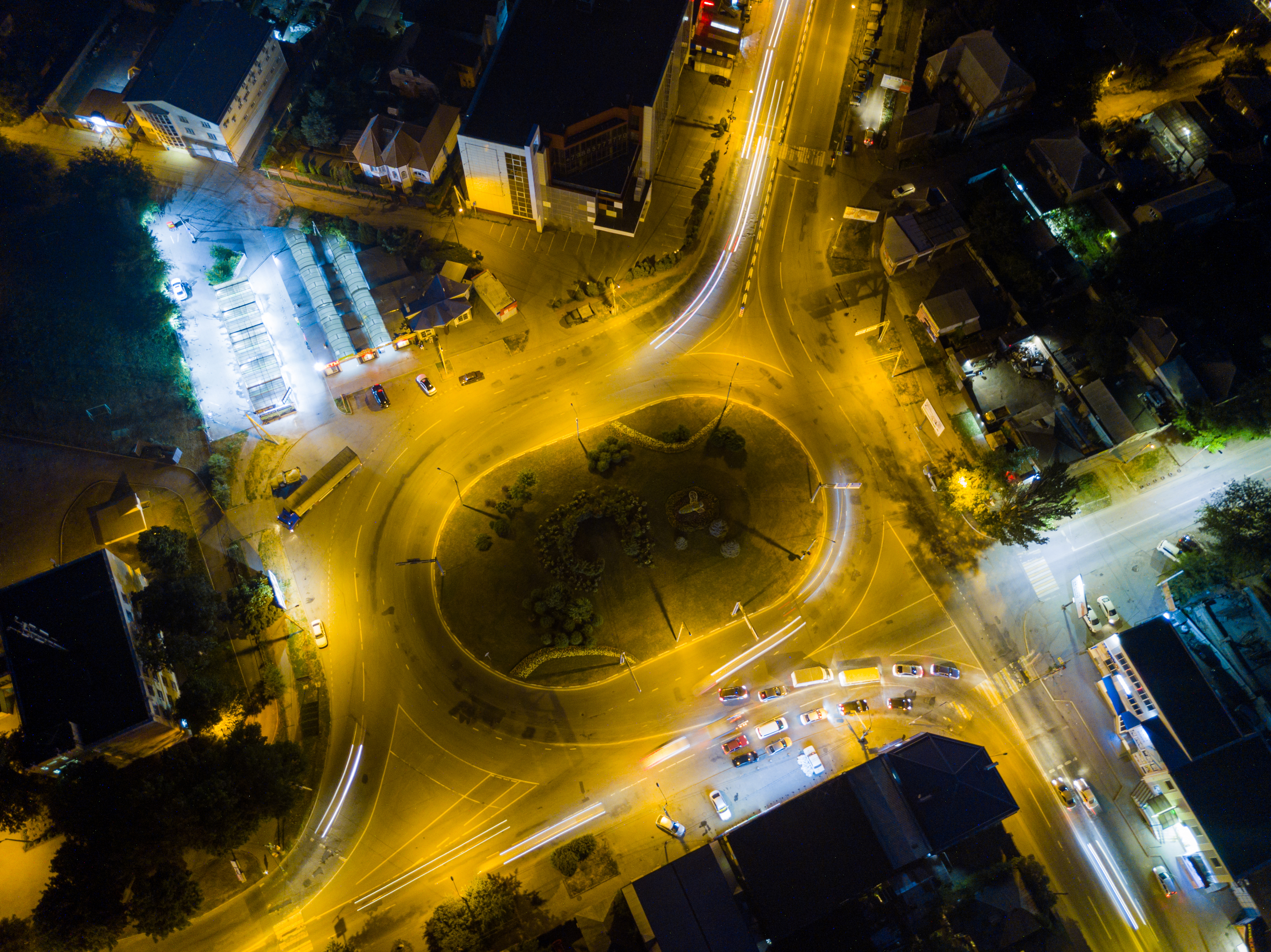 An aerial nighttime view of a roundabout illuminated by artificial lights, creating a captivating interplay of shadows and glares that pierce through the darkness. The high-angle perspective reveals the scale of urban infrastructure, where curved roads intertwine with bright streetlights, and vehicle headlights draw dynamic lines across the asphalt. Beyond the roundabout, the city unfolds as a picturesque landscape, where buildings, streets, and parks merge into a unified light symphony. The air feels charged with energy, as if every lamp and streetlight is part of a giant mechanism controlling the rhythm of nighttime movement. The top-down view not only showcases the geometry of the road network but also highlights human presence within the space, where technology and nature find balance.