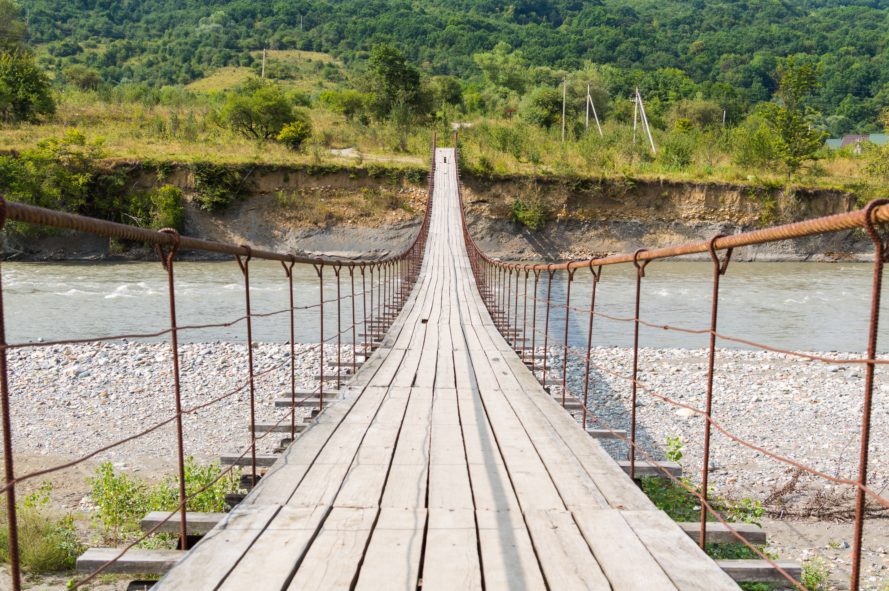 На фотографии представлен захватывающий дух вид на старинный деревянный подвесной мост, расположенный в живописном горном ущелье. Мост, выполненный из грубо обработанных досок, простирается через бурную горную реку с кристально чистой водой. Берега реки покрыты галькой и камнями различного размера, а по обе стороны видны склоны, поросшие густой зеленой растительностью. Яркое солнце освещает пейзаж, создавая игру света и тени на деревянных досках моста и на воде в реке. Вид сверху позволяет оценить всю протяженность моста и его конструкцию, состоящую из крепких стальных тросов, поддерживающих деревянное перекрытие.