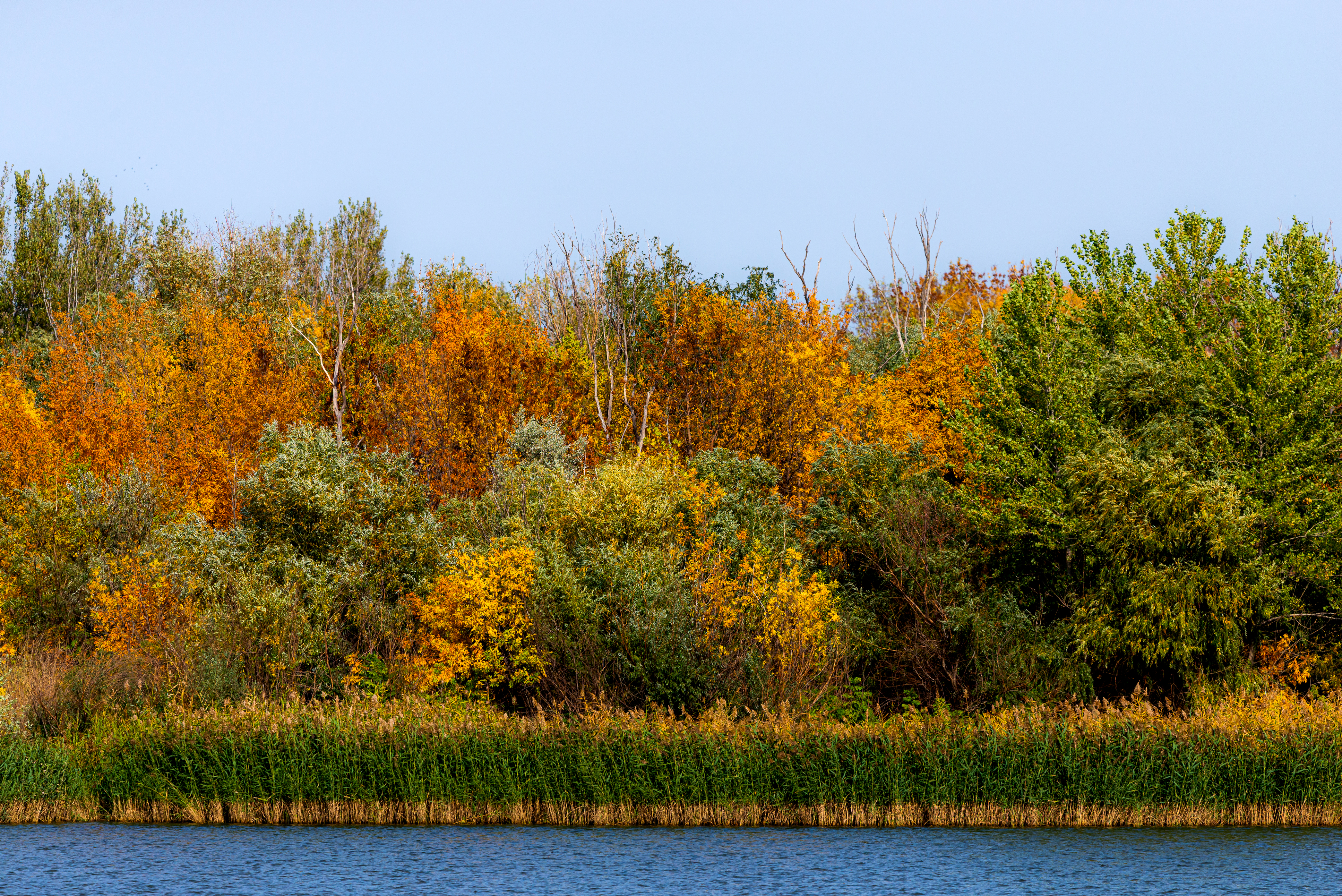 Это очаровательное изображение показывает спокойный осенний лес, граничащий с тихой рекой, обрамлённый чистым голубым небом. Яркий сезонный переход ясен в богатом полотне листвы — золотые и огненно-оранжевые тона контрастируют с оставшимися зелёными листьями на деревьях и кустарниках. Густая линия тростника у воды добавляет текстурную глубину композиции, а поверхность реки слегка отражает окружающую природу. Сцена разворачивается под ярким дневным светом, который усиливает каждый деталь — от шероховатой коры стволов до тонких прожилок на листьях. Это не просто пейзаж, но и полное погружение в тихую красоту природы во время осени.