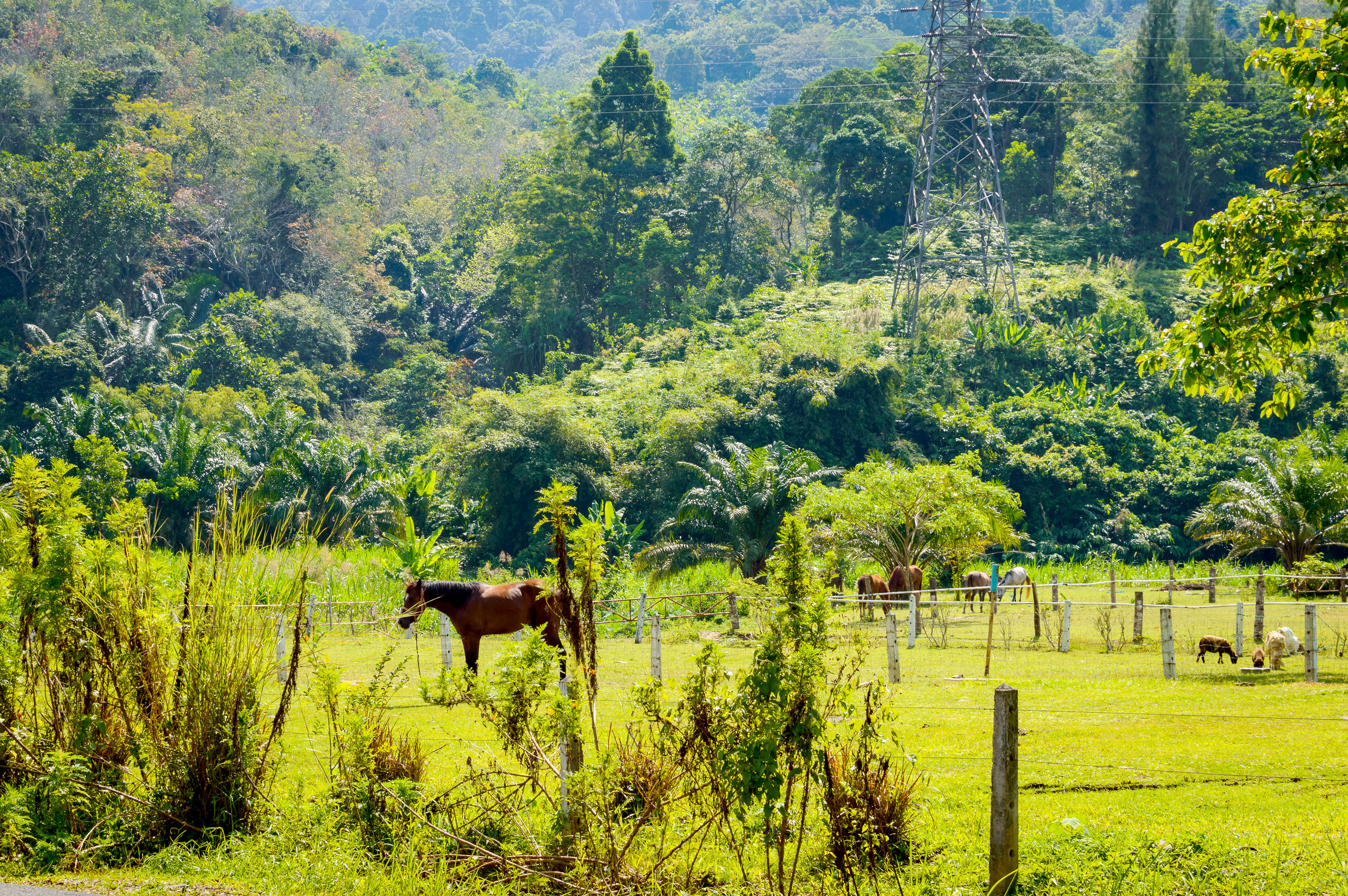 Эта завораживающая картина изображает спокойную пастушью сцену, где одна лошадь пасется на солнечном лугу, окруженном зеленым тропическим лесом. Место напоминает удаленную деревенскую местность — возможно, рядом с небольшим поселком или фермой, где густая зелень доминирует на каждом плане от переднего плана до далеких склонов холмов. Высокий электрический опорный столб служит неожиданным, но реалистичным маркером современной инфраструктуры, слегка намекая на человеческое присутствие без нарушения естественного единства. Яркая зеленая трава, разнообразные оттенки листвы и игра солнечного света, пробивающегося сквозь крону деревьев, создают живописную ткань, приглашающую зрителя в это идиллическое пространство.