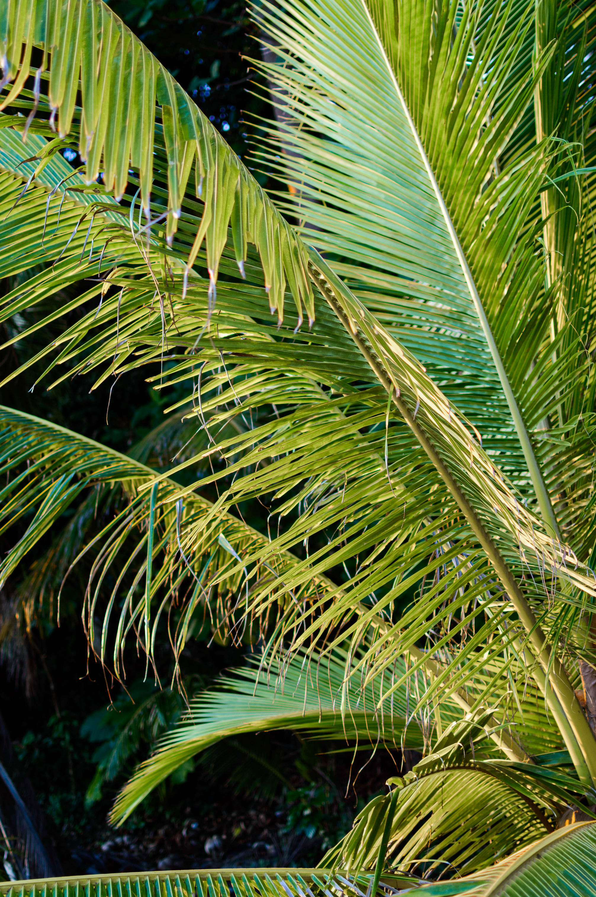 На изображении запечатлены крупные, зелёные листья пальмы, которые вырастают из темного и глубокого фона. Они напоминают о тропических джунглях, где каждый листок словно танцует в лучах солнца. Сочетание контрастных цветов делает снимок настоящим произведением природы. Вокруг листьев виднеются только черные тени и узкие просветы, что придает изображению загадочный и мистический характер. Настроение работы - спокойное и медитативное, словно зрителю дарит уютный уголок в тропиках.