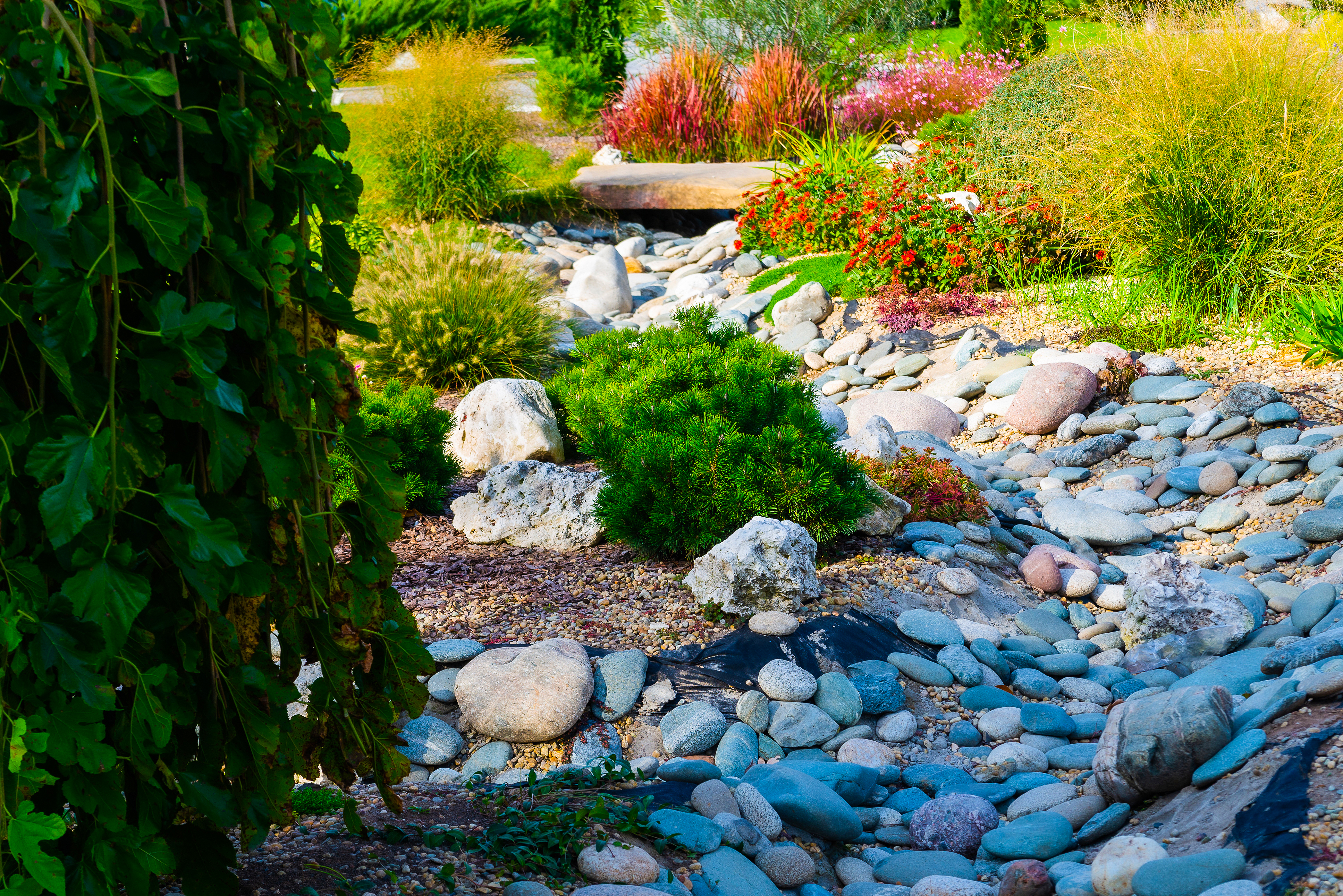 This captivating image showcases a carefully crafted stone river meandering through an idyllic garden, creating a naturalistic yet structured landscape. The scene unfolds under bright summer sunlight, casting warm golden hues across the composition and illuminating every detail from smooth rounded stones to vibrant foliage. The pathway is formed by a gentle cascade of variously sized pebbles and larger boulders, interspersed with rich earthy mulch and delicate gravel. Lush green shrubs, including evergreen conifers, stand as silent sentinels alongside bursts of red, orange, and pink ornamental grasses and flowering plants that add dynamic color contrast. The garden's design appears both wild and curated, suggesting a harmonious blend of nature’s organic forms with intentional human arrangement. In the background, soft-focus trees and additional plantings enhance depth while framing this miniature waterless stream.