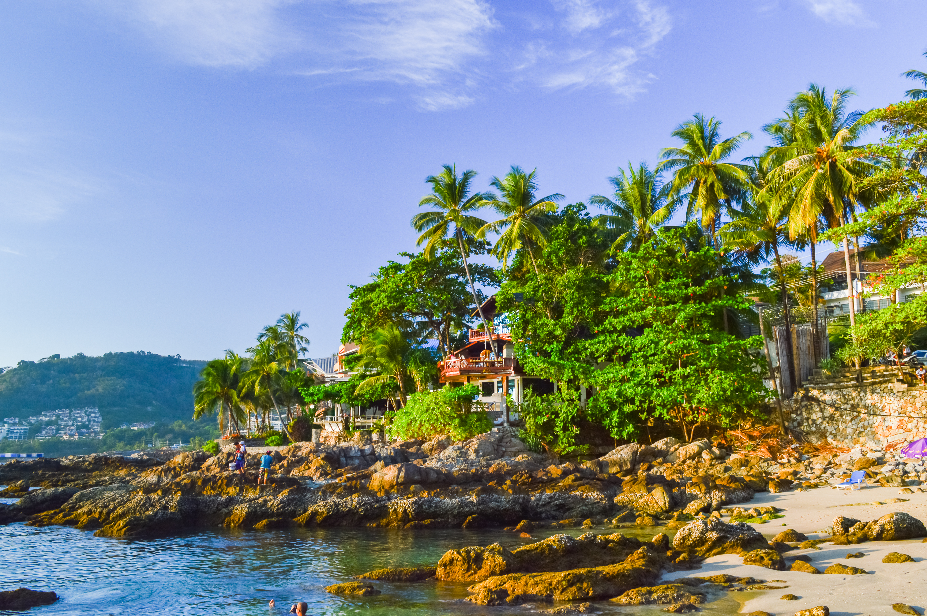 Это завораживающее изображение показывает очаровательный коттедж, расположенный на скалистых уступах над бирюзовым океаном, окруженный густой тропической растительностью и высокими пальмами. Сцена разворачивается под обширным голубым небом с легкими белыми облаками, что указывает на ясный летний день в отдаленном тропическом раю. На заднем плане холмы покрыты зеленью и скрывают намеки на удаленные поселения вдоль побережья, добавляя глубину этой идеальной сцене. Передний план украшен солнечными скалистыми берегами, где можно увидеть людей, наслаждающихся водой и песчаными участками, создавая динамическое взаимодействие между природой и человеческим отдыхом.
