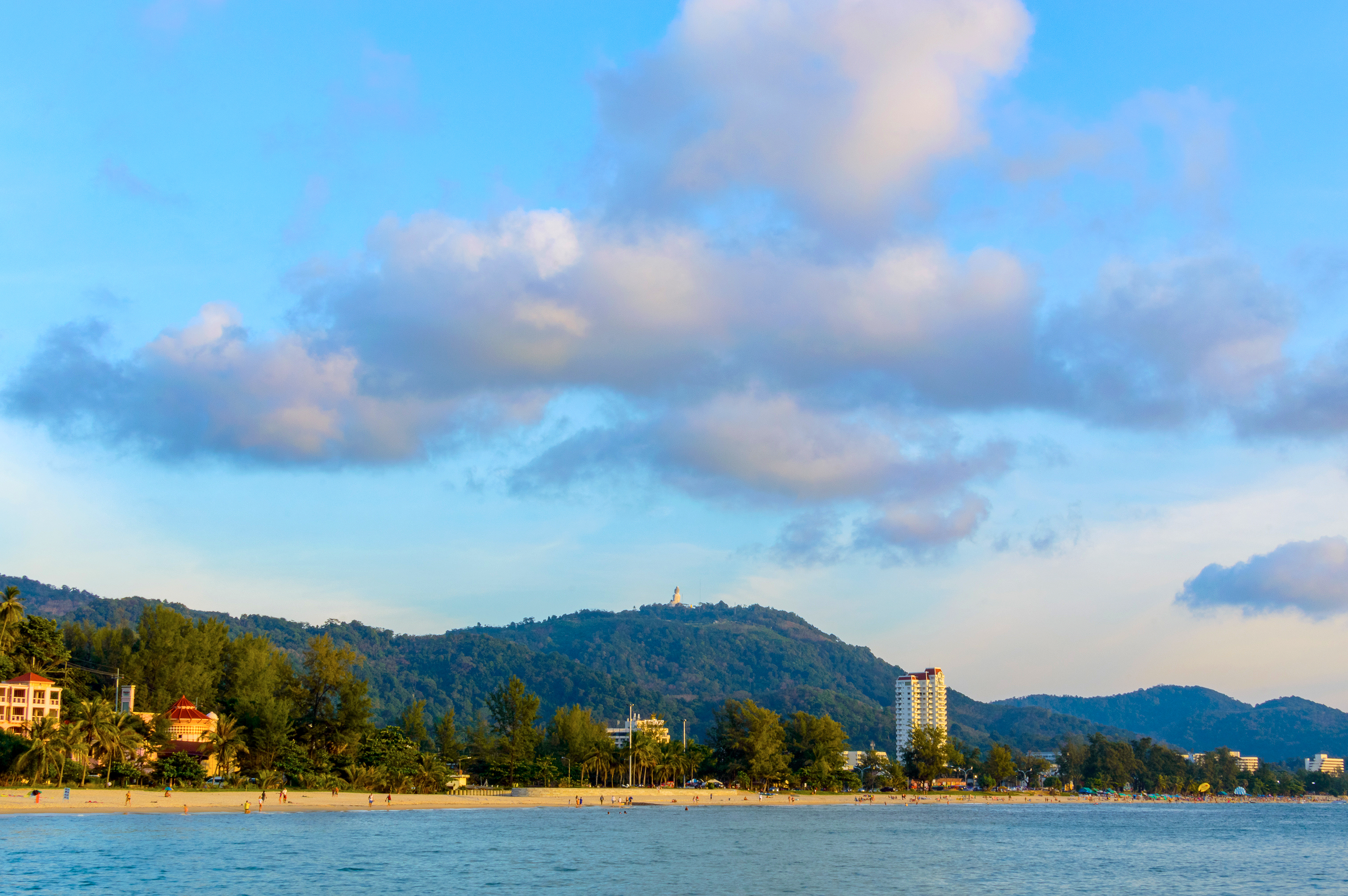 This breathtaking coastal landscape captures a tranquil moment where the calm sea meets lush green hills under a vast blue sky dotted with soft, fluffy clouds. The scene unfolds from a high-angle perspective, revealing a harmonious blend of natural beauty and subtle urban elements. Distant buildings peek through the treeline, suggesting a resort town or coastal village nestled between nature and civilization. The golden hour sunlight casts gentle warmth over the entire panorama, enhancing the vividness of the greenery and the serene blue waters. This image perfectly encapsulates the peaceful essence of tropical seaside destinations during late afternoon, inviting viewers to imagine themselves walking along the shoreline or simply admiring this picturesque vista from a quiet vantage point.