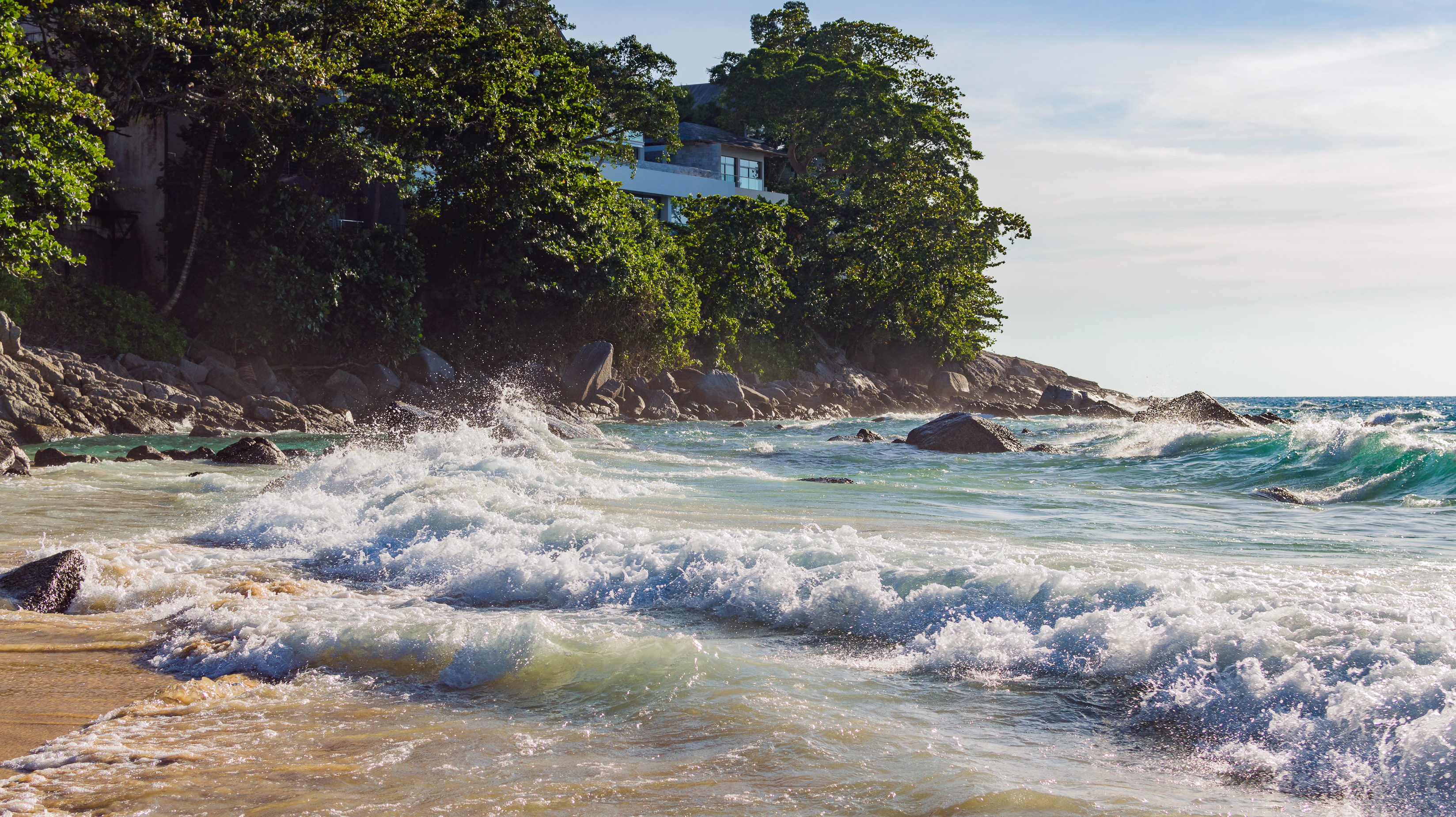 The photograph employs an eye-level perspective that immerses viewers directly into the action at the shoreline. Key objects include frothing ocean waves, dark textured rocks, golden wet sand, lush green tropical trees, a contemporary white villa with large windows, and distant horizon lines of calm sea meeting sky. The color palette is rich with natural tones: deep greens of vegetation, warm beige sands, sparkling turquoise water, and the crisp blue of the clear sky. Textures vary from smooth sandy surfaces to rough rocky outcrops and soft leafy canopies. Lighting comes from bright overhead sunlight that casts sharp contrasts on wet surfaces while illuminating the misty spray rising from breaking waves. The composition balances dynamic foreground elements with tranquil background structures, guiding eyes toward both natural spectacle and human habitation.