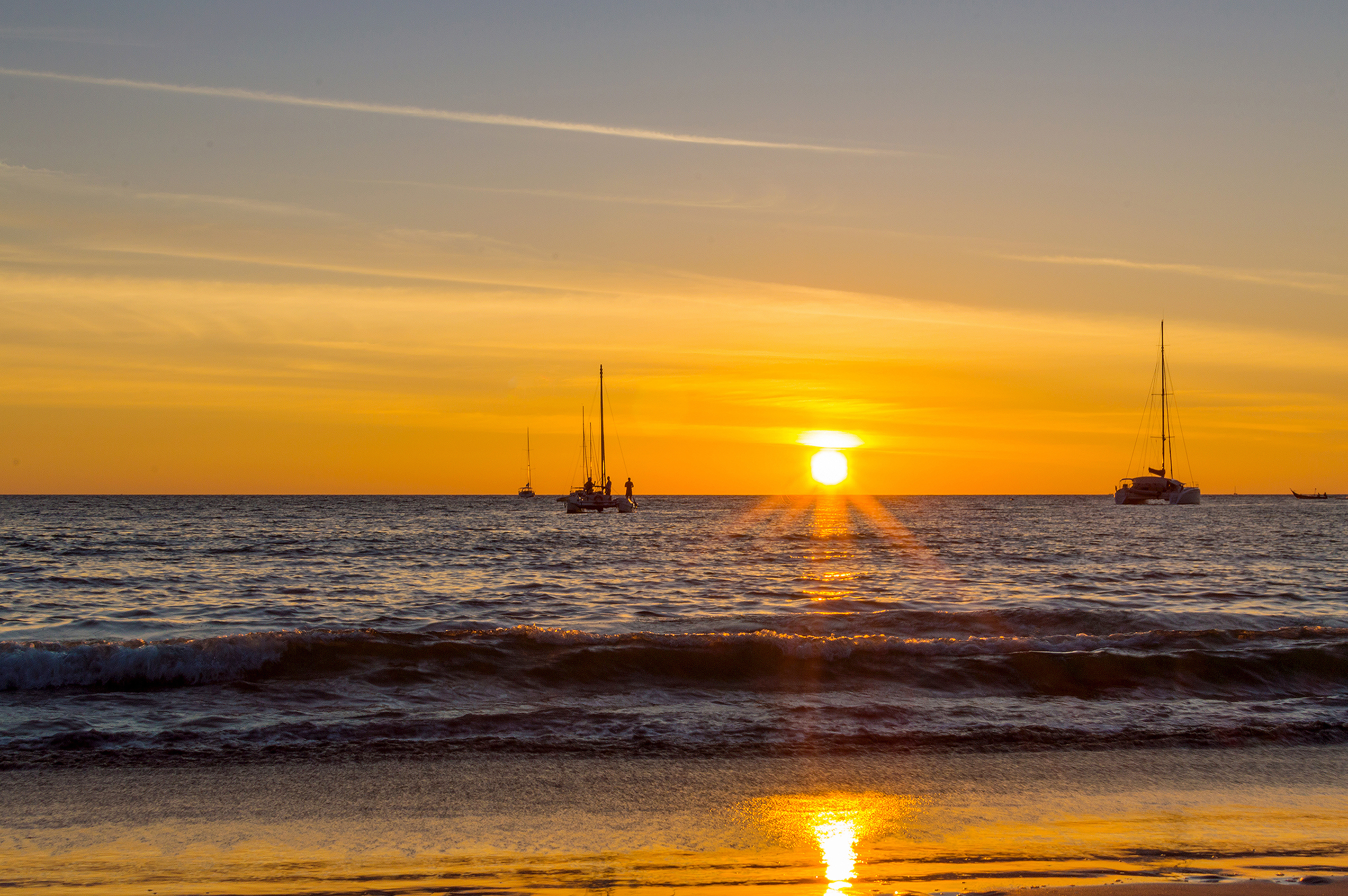 Это захватывающее фото представляет собой спокойную сцену заката над океаном, где яхты элегантно вырисовываются силуэтами на фоне бескрайнего неба, окрашенного в тёплые оттенки оранжевого и золотистого. Горизонт тянется без конца, разделяя спокойную воду и сияющие небеса, создавая ощущение безграничной тишины. Легкие волны ритмично прибывают на берег, их гребни поймают уходящий свет, создавая мерцающие отражения, играющие по мокрому песку. Атмосфера глубоко спокойна, приглашая зрителей остановиться и полностью погрузиться в тишину величия природы.