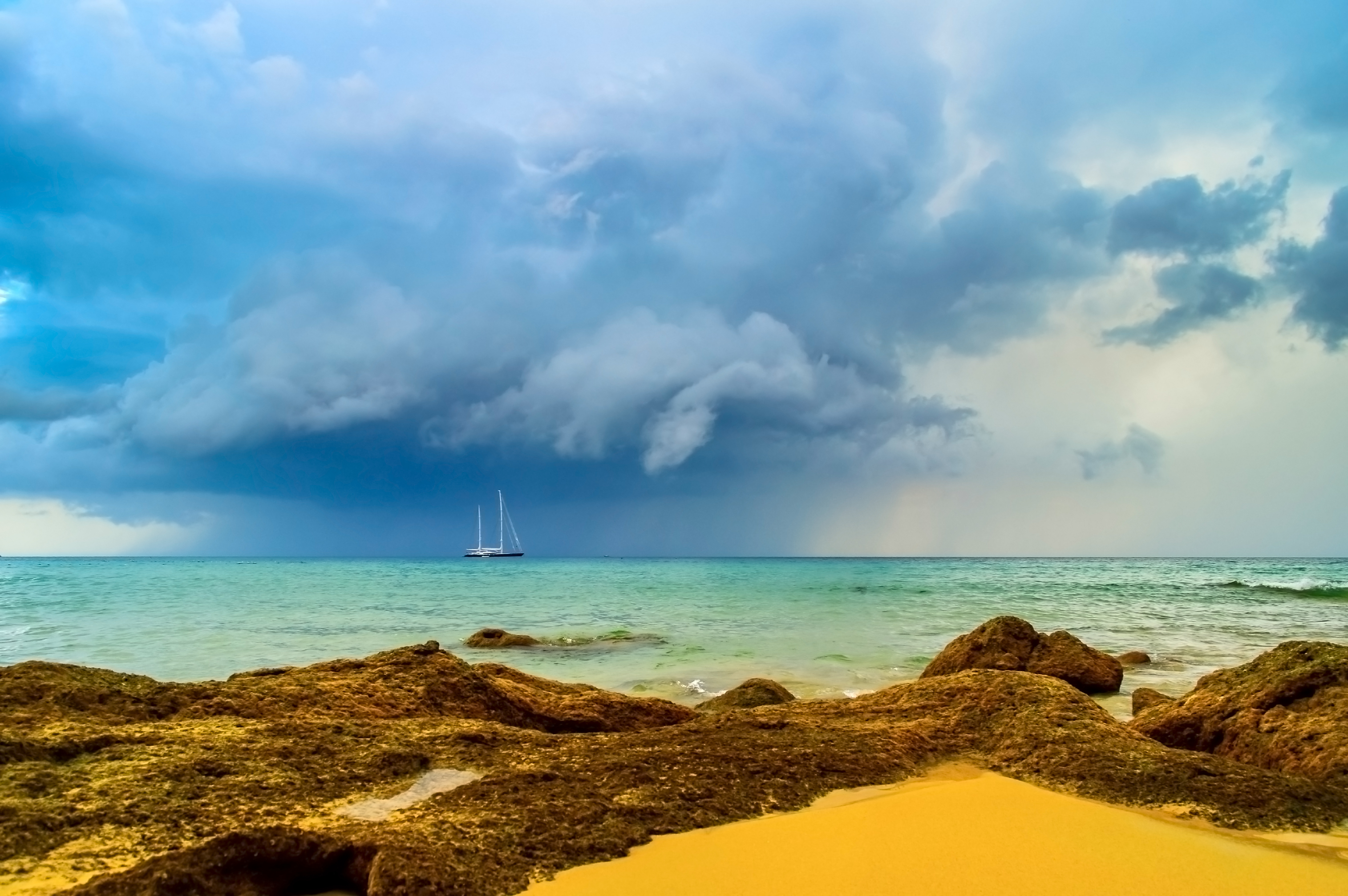 Это захватывающее изображение представляет собой мощный и спокойный прибрежный ландшафт под влиянием драматической бури. Сцена разворачивается над обширным океаном, где одинокий парусник сохраняет спокойствие среди наступающей погоды, что намекает на устойчивость перед силой природы. Яркая радуга изящно аркой пересекает горизонт, создавая сильный визуальный контраст между тёмными, бурными облаками неба и ярко-бирюзовым морем ниже. В переднем плане золотистый песок смешивается с выветренными, мохнатыми камнями, которые ограждают композицию и укореняют зрителя в реальности этого пляжного окружения. Небо доминирует плотными, вихревыми облаками бури, намекая на возможный или недавний дождь, одновременно демонстрируя редкое метеорологическое явление — радугу. Этот контраст между угрожающей погодой и прекрасным оптическим феноменом создаёт динамичное напряжение, которое приглашает размышления. Освещение мягкое, но насыщенное, усиливая богатую цветовую палитру от тёмно-синего до тёплого жёлтого, подчёркивая как мощь, так и красоту природы.