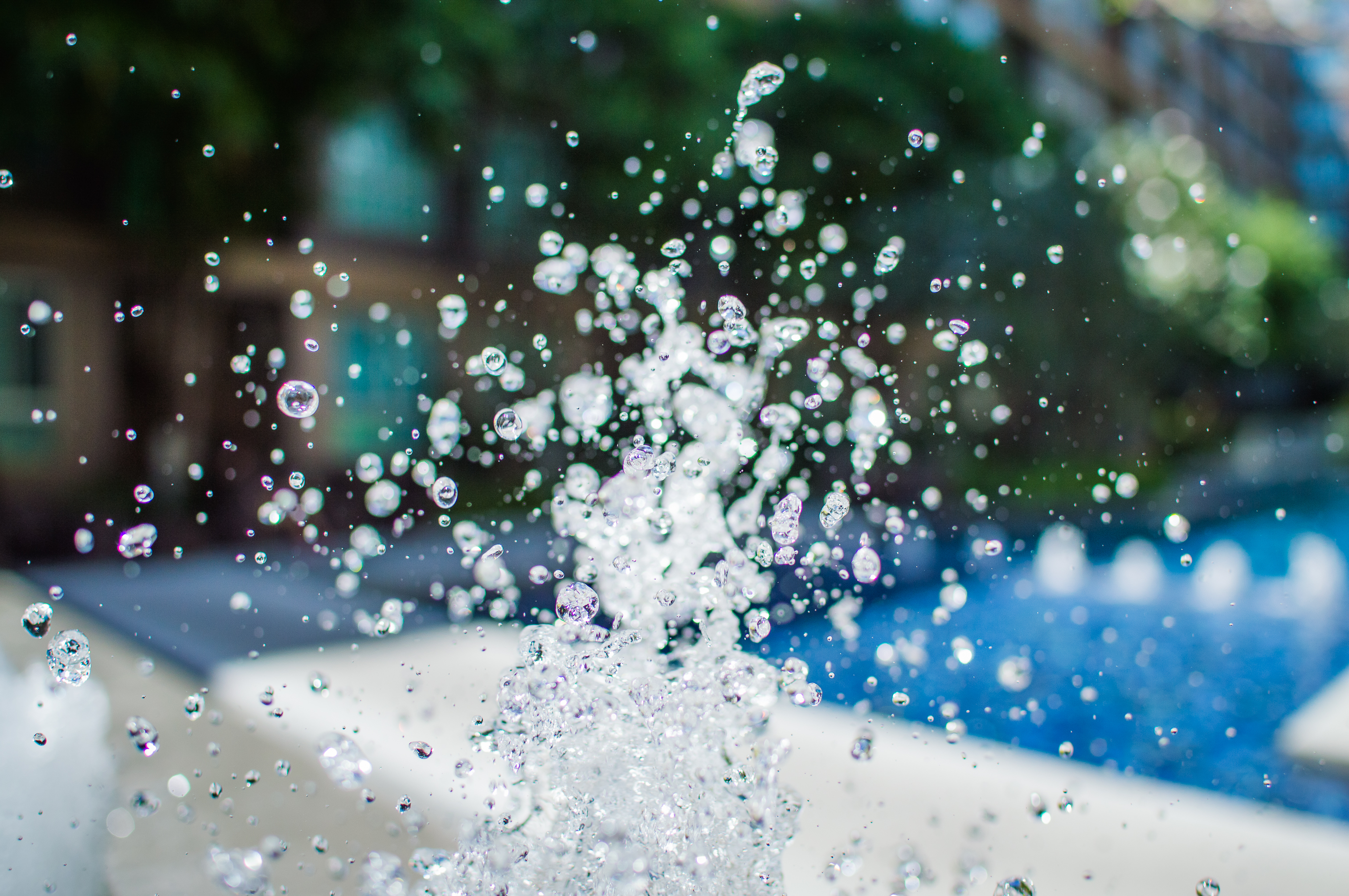 Это захватывающее изображение представляет собой макро-представление капель воды, замерзших в воздухе во время динамического брызга, вероятно, снятых у края городского бассейна или фонтана. Фотография сделана с использованием малой глубины резкости, превращающей фон в мягкие, размытые формы зеленой листвы и отдаленных архитектурных элементов. Этот подход направляет все внимание на мельчайшие детали каждой капли: их сферическую форму, внутренние рефракции солнечного света и слабое искрение, вызванное дифракцией света по криволинейным поверхностям. Сцена освещена естественным дневным светом, усиливающим сверкающую чистоту и холодные тона, доминирующие в композиции. Каждая капля выглядит как маленький призма, отражающая окружающий свет, создавая почти кристаллическую текстуру, которая контрастирует с гладкой поверхностью камня или бетона под брызгом.