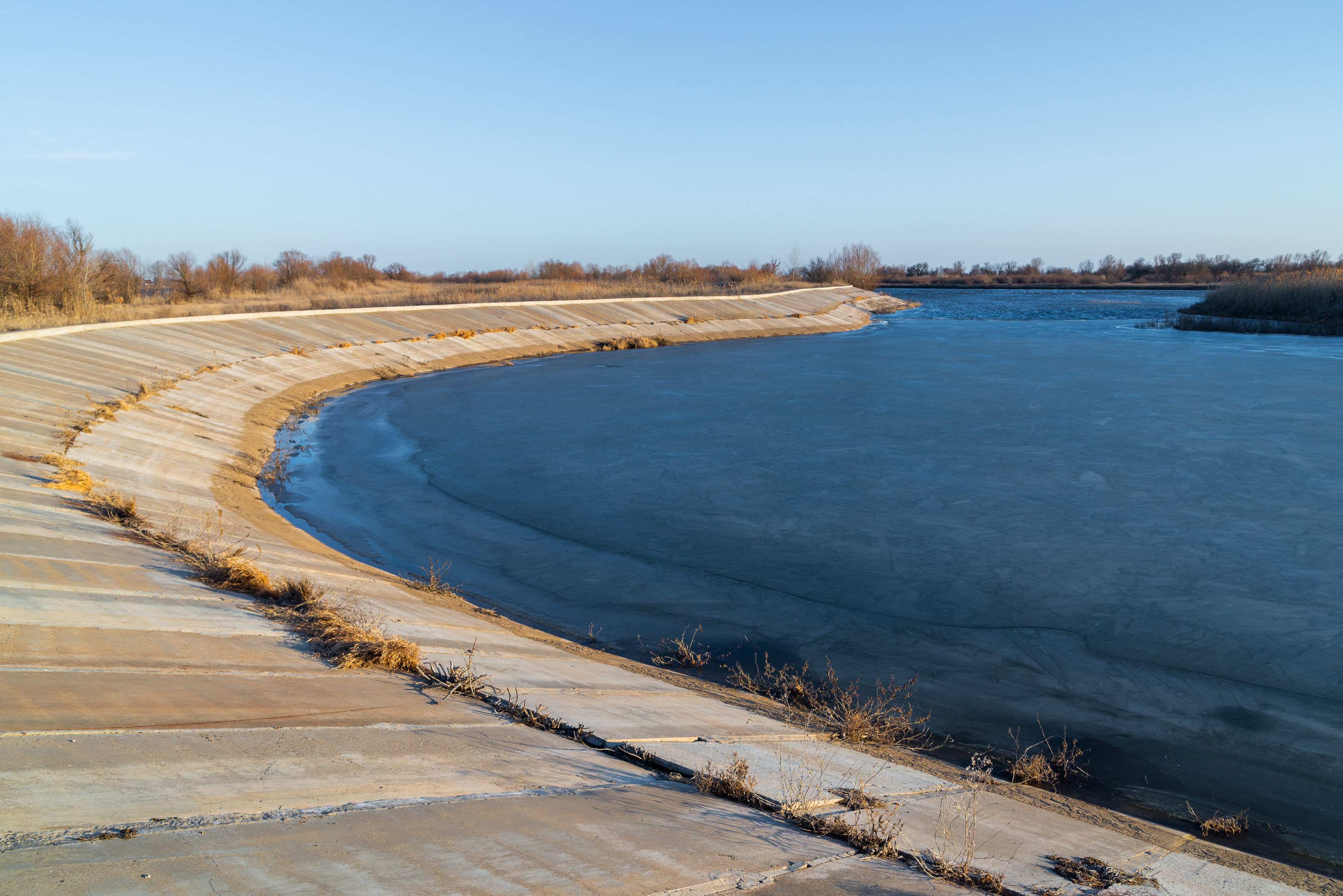 This photograph captures a tranquil winter landscape where a wide, frozen river flows alongside a meticulously constructed concrete embankment. The scene unfolds under an expansive, cloudless blue sky that contrasts sharply with the icy surface of the water and the dry, golden-brown vegetation clinging to the bank. The curved geometry of the embankment creates a dynamic yet harmonious composition, drawing the viewer’s eye along its gentle arc toward the distant treeline where bare branches stretch against the horizon. The late afternoon sun casts long, soft shadows across the concrete surface, accentuating its textured ridges and seams while illuminating frost-kissed patches of dry grass that peek through cracks in the pavement. This image evokes a profound sense of solitude and stillness, suggesting a moment frozen not only in time but also in emotion — a quiet pause before spring’s awakening or after winter’s retreat. The interplay between man-made structure and natural elements — the rigid lines of concrete juxtaposed with organic forms of grass and trees — creates a subtle dialogue that speaks to both urban planning and untouched wilderness, reminding us of how seamlessly human intervention can coexist with nature's cycles.