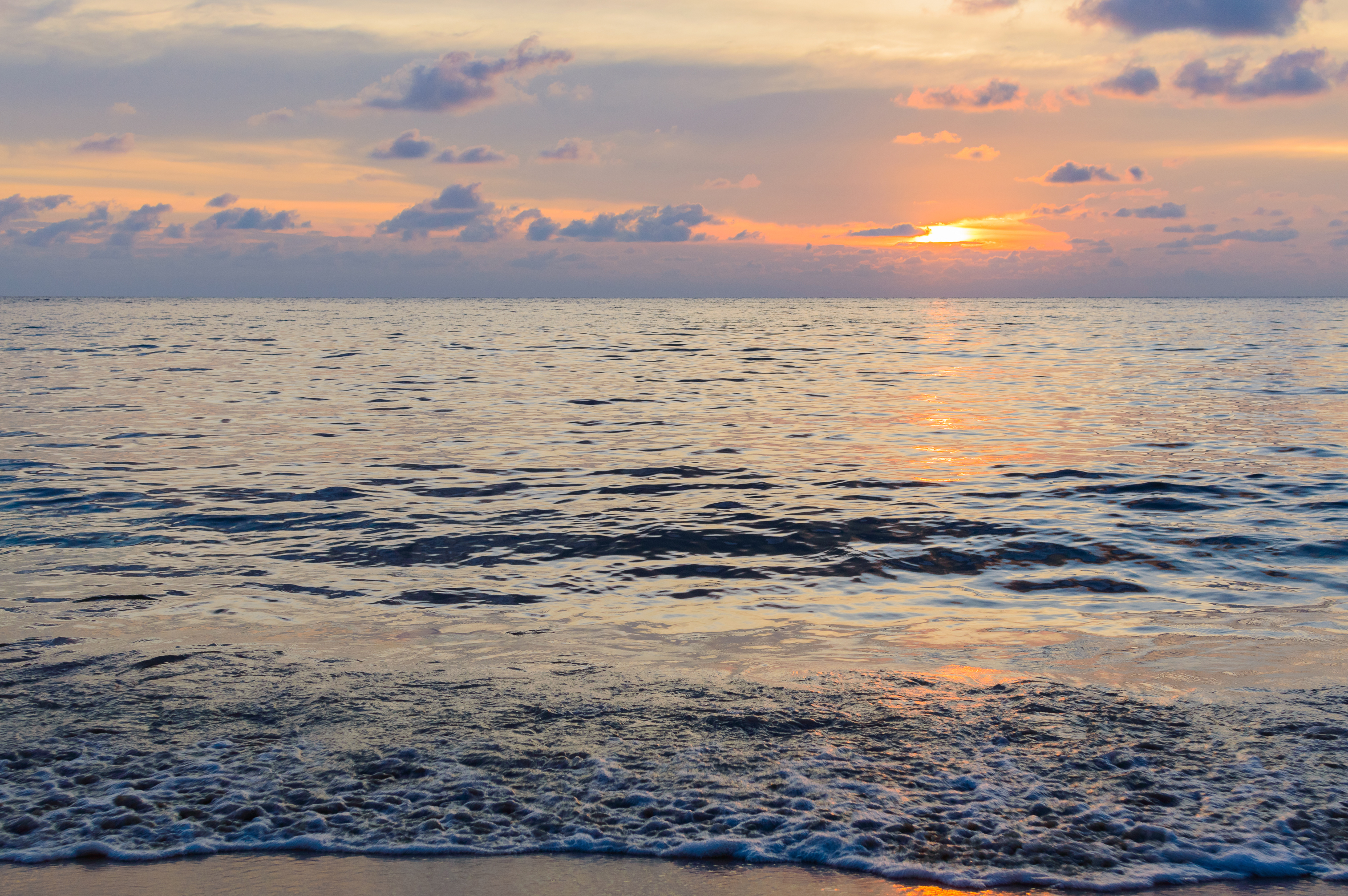 Композиция тщательно сбалансирована: линия горизонта делит небо от воды, подчеркивая бескрайность океана. Цвета плавно переходят от ярко-оранжевого у солнца до более мягких синих и фиолетовых тонов выше в облаках. Текстуры насыщенно переданы: шершавость пенящихся волн контрастирует с гладкой поверхностью дальней воды. Освещение мягкое и рассеянное, характерное для утреннего или вечернего времени, создает нежные тени, усиливающие глубину без резких переходов. Общее настроение — это спокойная размышляющая атмосфера, приглашающая зрителя остановиться и оценить тонкую величественность природы.