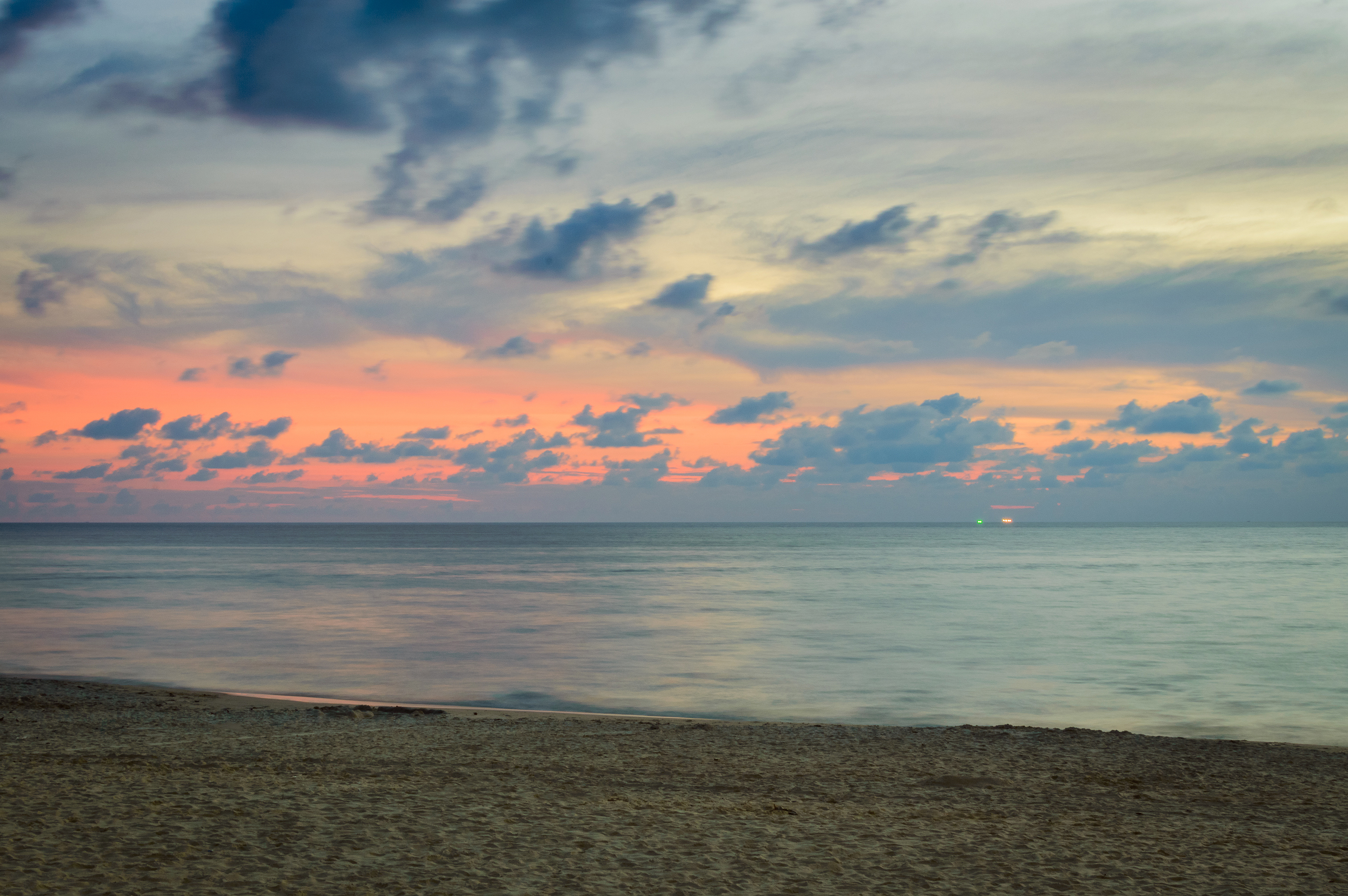Это захватывающее изображение запечатлело спокойный золотой рассвет над океаном, где тёплые тона оранжевого и розового плавно переходят в мягкие сине-серые облака. Горизонт тянется по всей рамке, разделяя спокойные воды от небес над ними, создавая ощущение простора и покоя. Вдали на поверхности воды мерцает свет корабля, добавляя глубину этой минималистичной сцене прибрежного пейзажа. Передний план — песчаный берег, текстурированный, но гладкий, словно не тронут человеком, что усиливает ощущение одиночества и естественной красоты. Для получения эффекта мягкого движения волн использована долгая выдержка, подчеркивающая тишину, сопровождающую зарю.