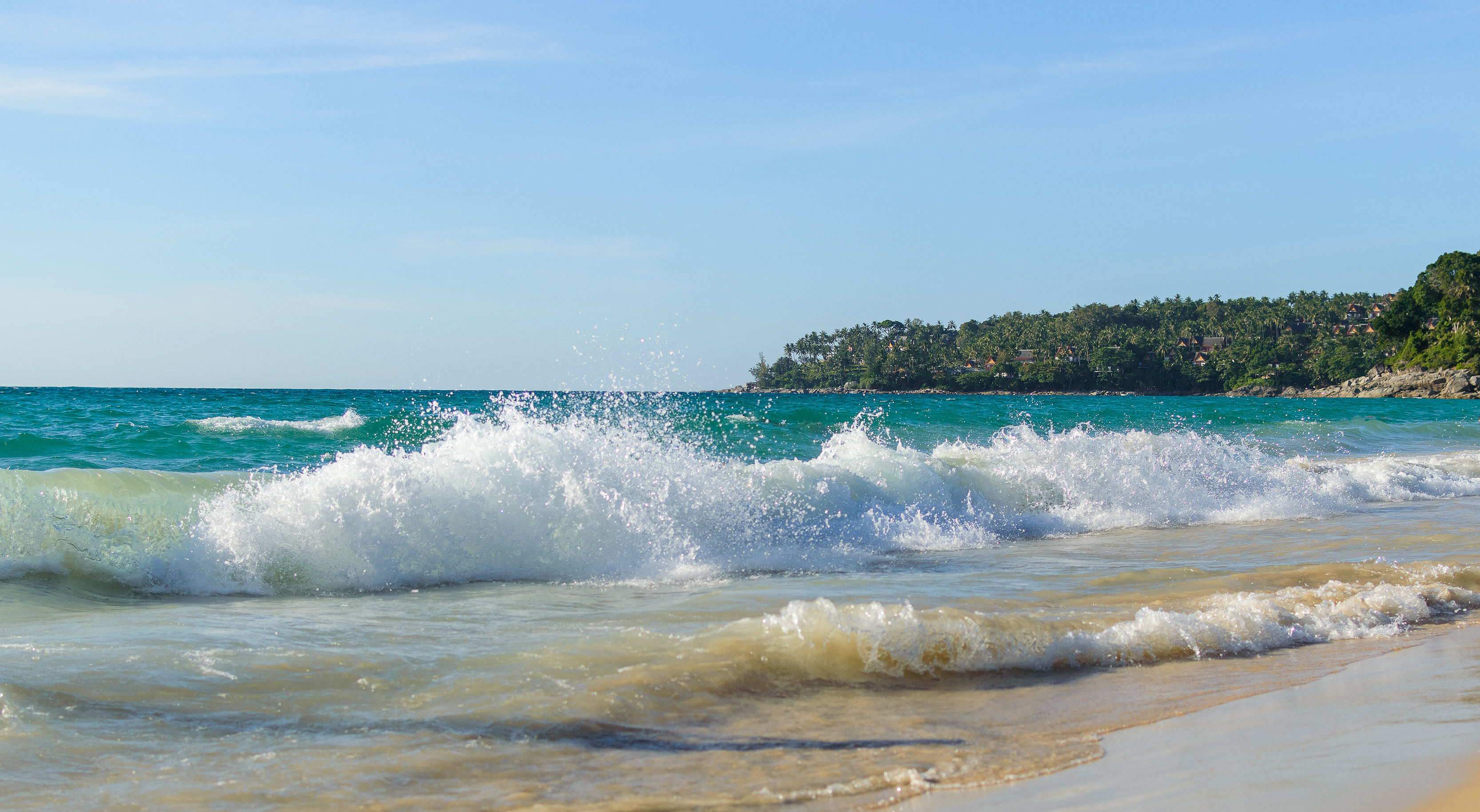 The composition expertly balances motion and stillness — the turbulent energy of breaking waves contrasts with the calm tranquility of the distant shoreline and clear blue sky. Textures are vividly rendered: from the granular detail of wet sand to the frothy, ephemeral nature of sea foam, every element invites close inspection. Sunlight bathes the entire scene in a warm, golden glow that enhances colors — deep blues of the ocean, vibrant greens of foliage, and soft beige tones of the beach. The perspective is slightly elevated, offering a sweeping view across the water’s surface while keeping the foreground waves as the central dramatic focus. The horizon line is deliberately placed to create depth, guiding the viewer's eye from the immediate action to the tranquil backdrop.