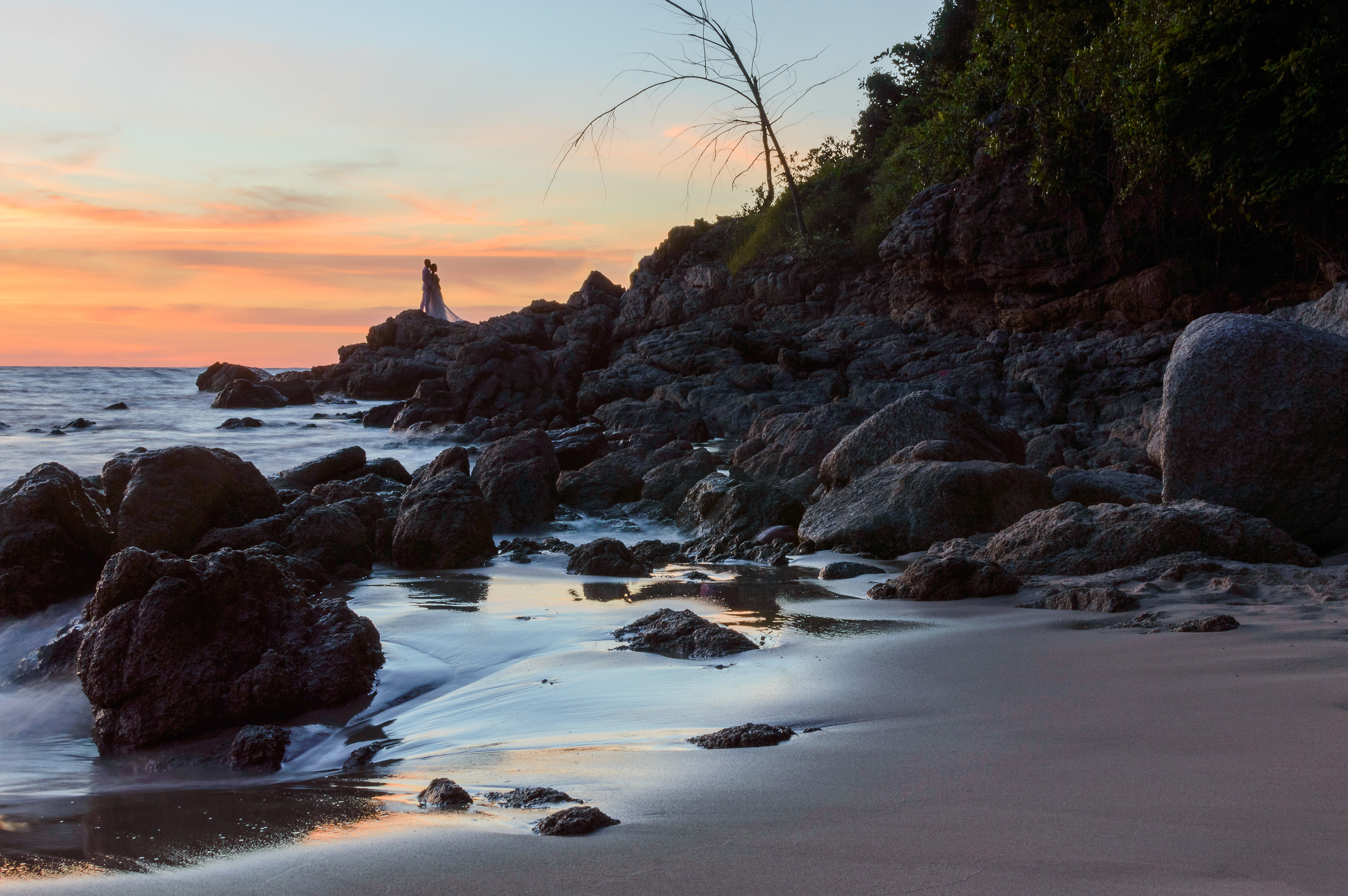 The overall mood is deeply contemplative and romantic, infused with a sense of quiet solitude and awe-inspiring natural wonder. The image evokes emotions of peace, introspection, and connection with nature’s grandeur. It invites viewers to pause, reflect, and feel the gentle rhythm of waves against rocks. The softness of light enhances the dreamlike quality, making it suitable for editorial or commercial use in contexts related to travel, love, relaxation, or personal growth. Artistically, this photograph balances realism with poetic abstraction—using long exposure to blur motion while retaining crisp textures, creating a timeless and emotionally resonant visual experience. The composition’s natural framing and balanced asymmetry make it visually engaging without appearing staged, capturing the raw beauty of an untouched tropical coastline at dusk.