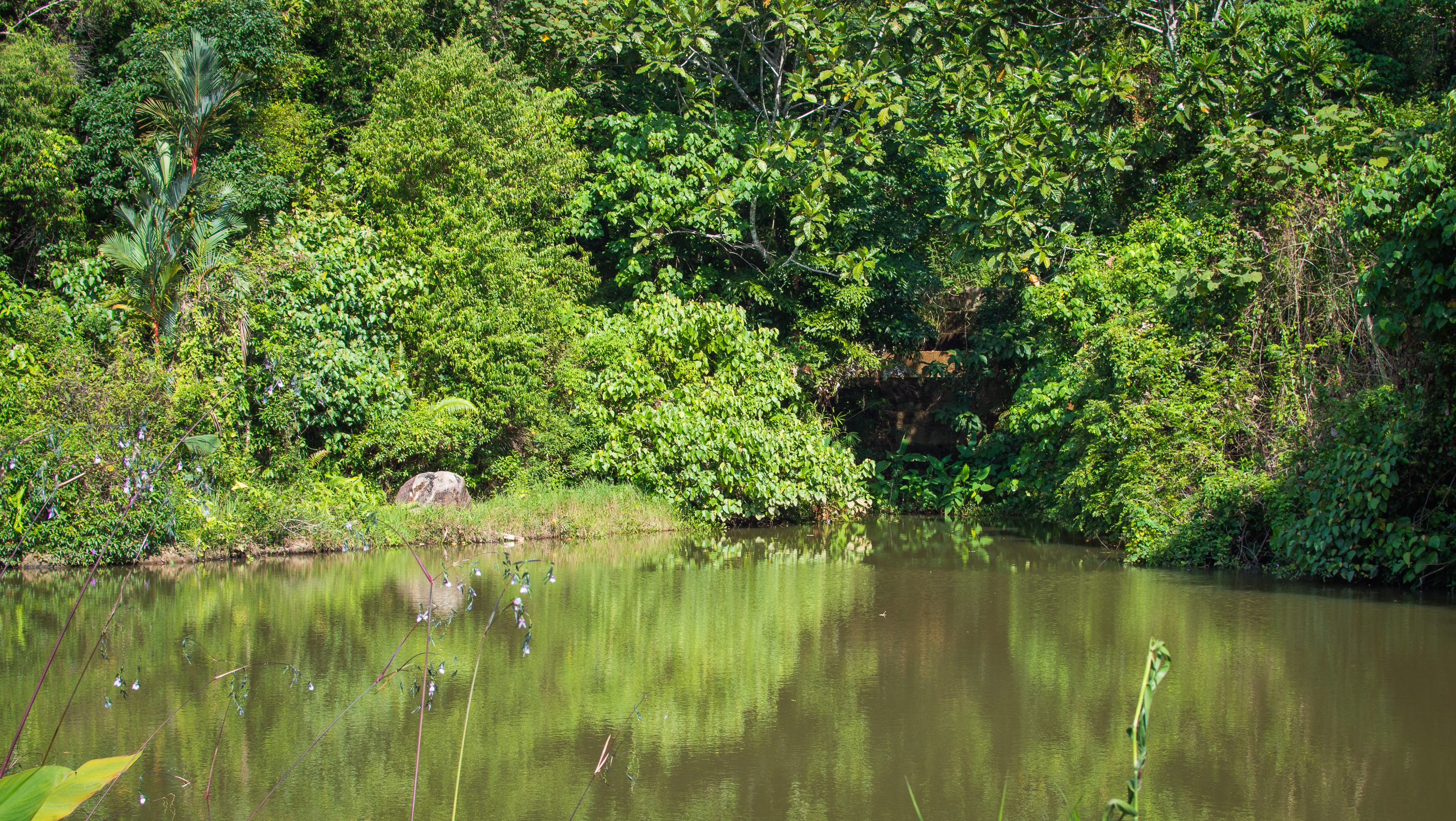 This captivating image captures a tranquil tropical lake nestled deep within a lush, dense green forest. The calm water surface acts as a mirror, perfectly reflecting the vibrant canopy of towering trees and thick underbrush that encircle it. Sunlight pierces through gaps in the foliage, casting dappled patterns of light and shadow across the shoreline and onto the gentle ripples of the lake. In the foreground, delicate wildflowers and slender grasses sway slightly at the water’s edge, adding texture and depth to the composition. The scene is bathed in bright daylight, suggesting a warm, clear day with no clouds interrupting the sun's rays. This untouched natural environment evokes a profound sense of peace and solitude, inviting viewers to imagine stepping into this secluded paradise far from urban noise.