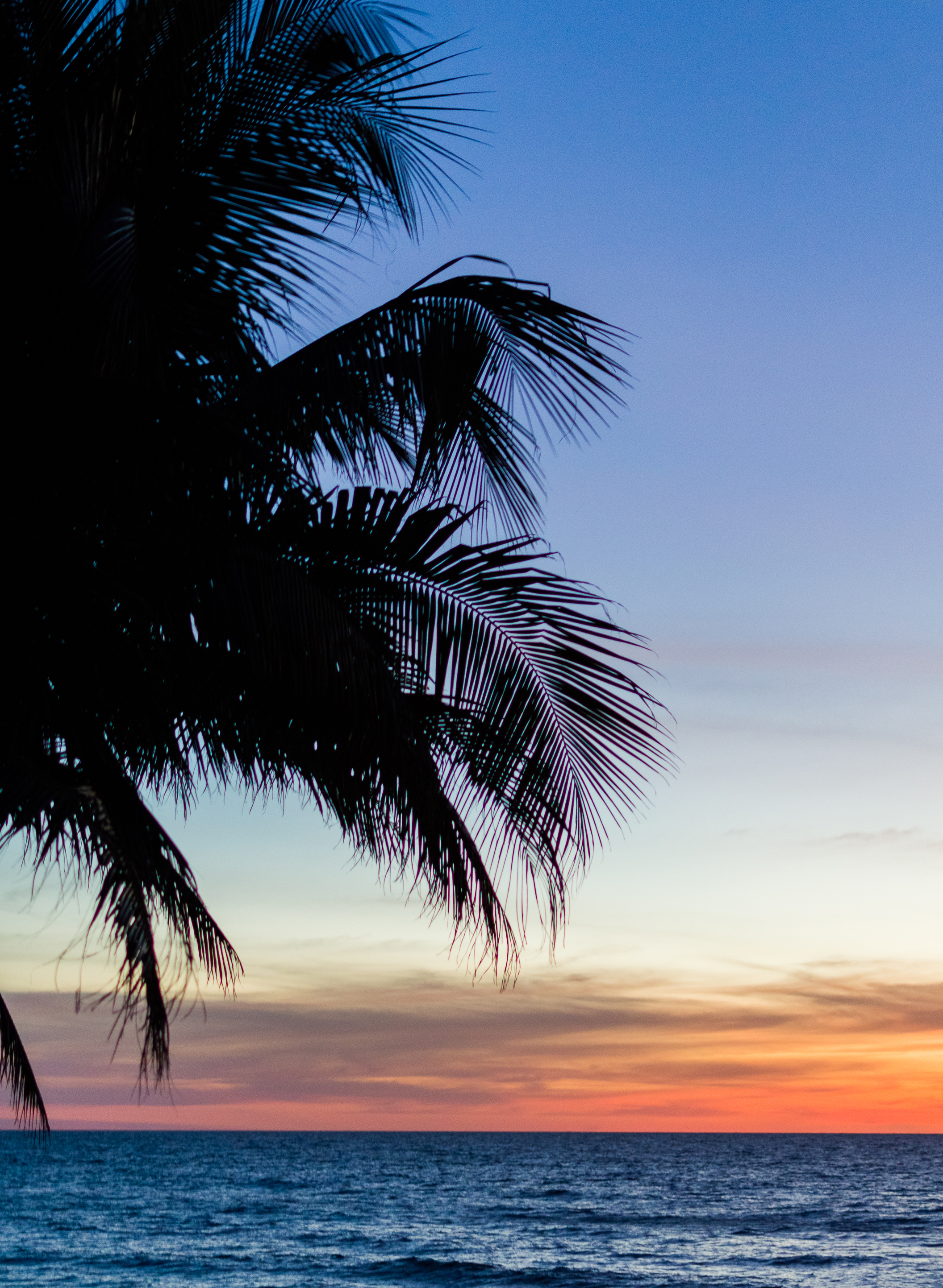 This captivating image presents a serene tropical sunset scene framed by the bold silhouette of a palm tree. The composition captures the tranquil beauty of an ocean horizon, where warm orange and pink hues of the setting sun melt seamlessly into the cool blue tones of the twilight sky. The calm waters below reflect the subtle gradient of colors, enhancing the peaceful ambiance. The palm fronds, sharply defined against the soft background, add a natural frame to the scene, guiding the viewer's eye toward the horizon. This photograph is ideal for evoking feelings of relaxation and escape, capturing a moment frozen in time that speaks to universal themes of peace, nature, and vacation dreams. Whether used as a travel poster or a digital wallpaper, this image instantly transports viewers to a tropical paradise where the sun sets slowly over endless blue waters. The composition emphasizes minimalism and harmony, using natural elements to create an emotional resonance that is both soothing and inspiring.
