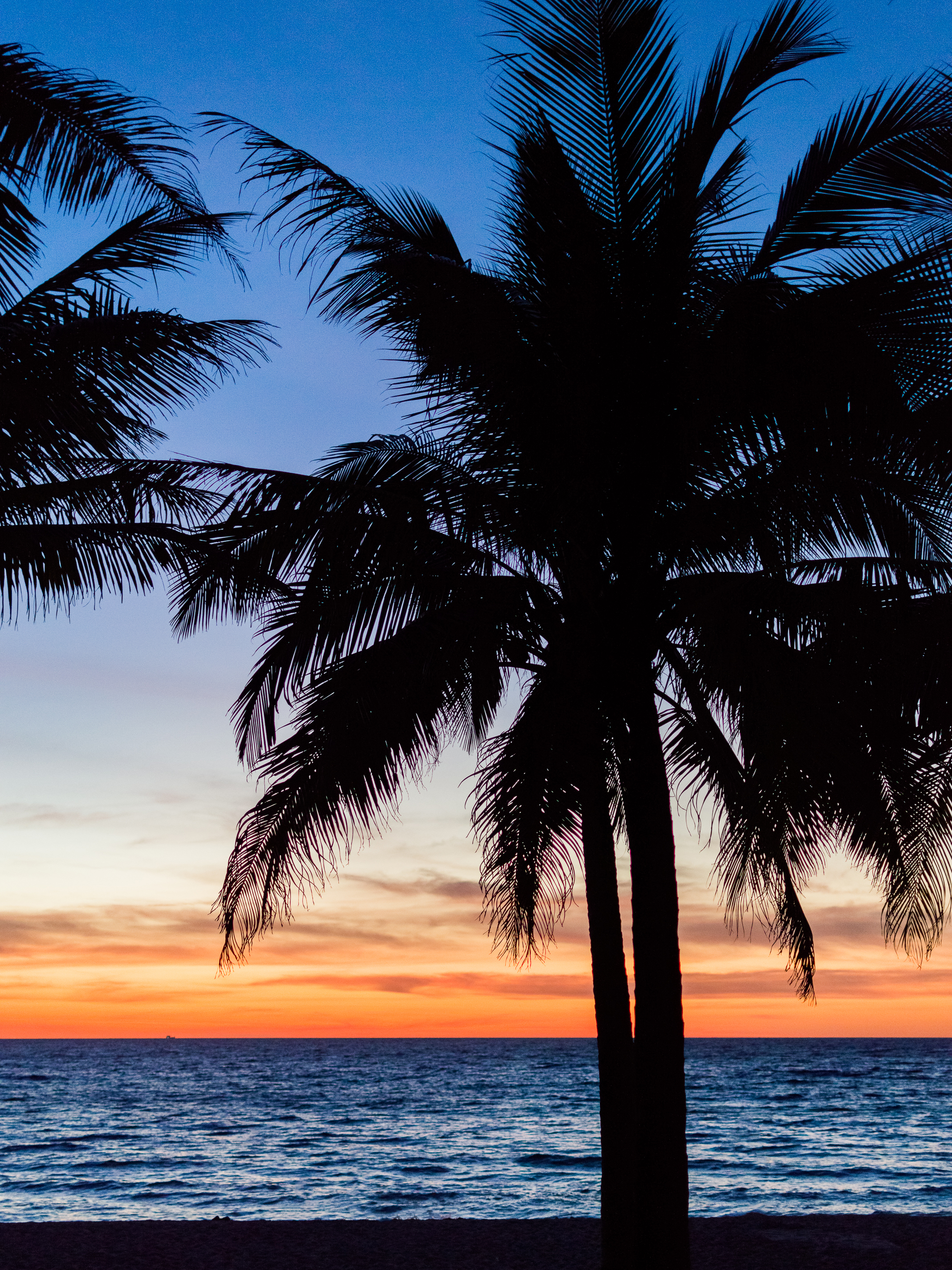 This captivating image presents a dramatic silhouette of tall palm trees set against the backdrop of a breathtaking sunset over an expansive ocean. The photograph was likely taken during twilight, as the sun dips below the horizon, casting elongated shadows and bathing the sky in radiant gradients of orange, pink, and deep blue. The tranquil waters shimmer gently under the fading light, while the dark outlines of palm fronds create a striking contrast against the luminous heavens. This scene evokes an unmistakable tropical paradise atmosphere, suggesting warm breezes, soft sand beneath bare feet, and the soothing sound of gentle waves.