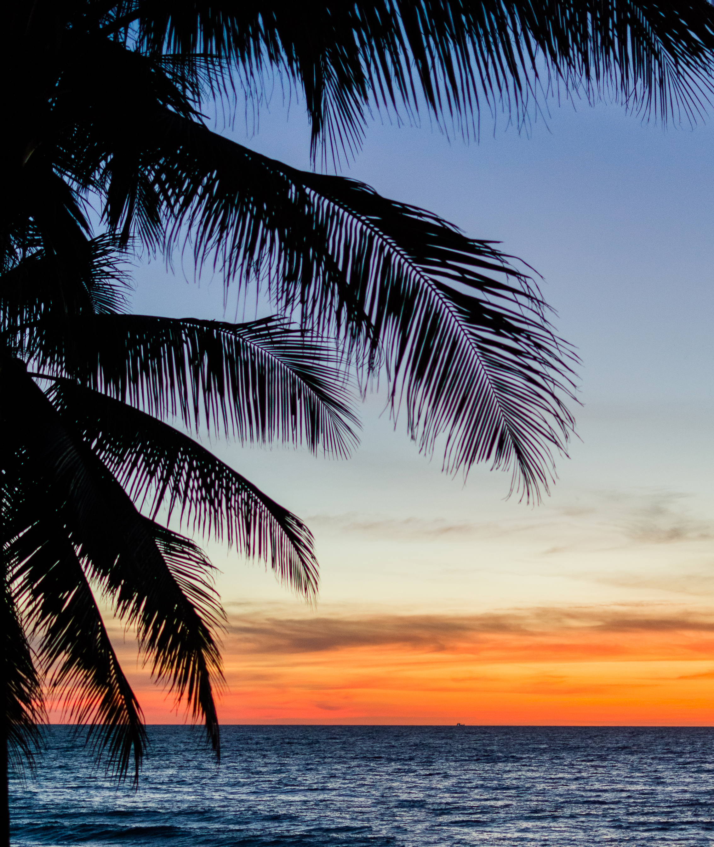 This breathtaking image captures a serene tropical sunset over the ocean, where the sky transitions from deep blue to fiery orange and gold hues. The silhouette of palm fronds gracefully frames the upper left corner, creating a natural border that draws the viewer’s eye toward the horizon. The calm waters mirror the vibrant colors above, while a distant ship adds scale and depth to the scene. This photograph was likely taken in Asia during late afternoon or early evening, showcasing the region's famous coastal beauty. The backlighting technique enhances the contrast between the dark palm leaves and the luminous sky, creating an ethereal and dreamlike quality.