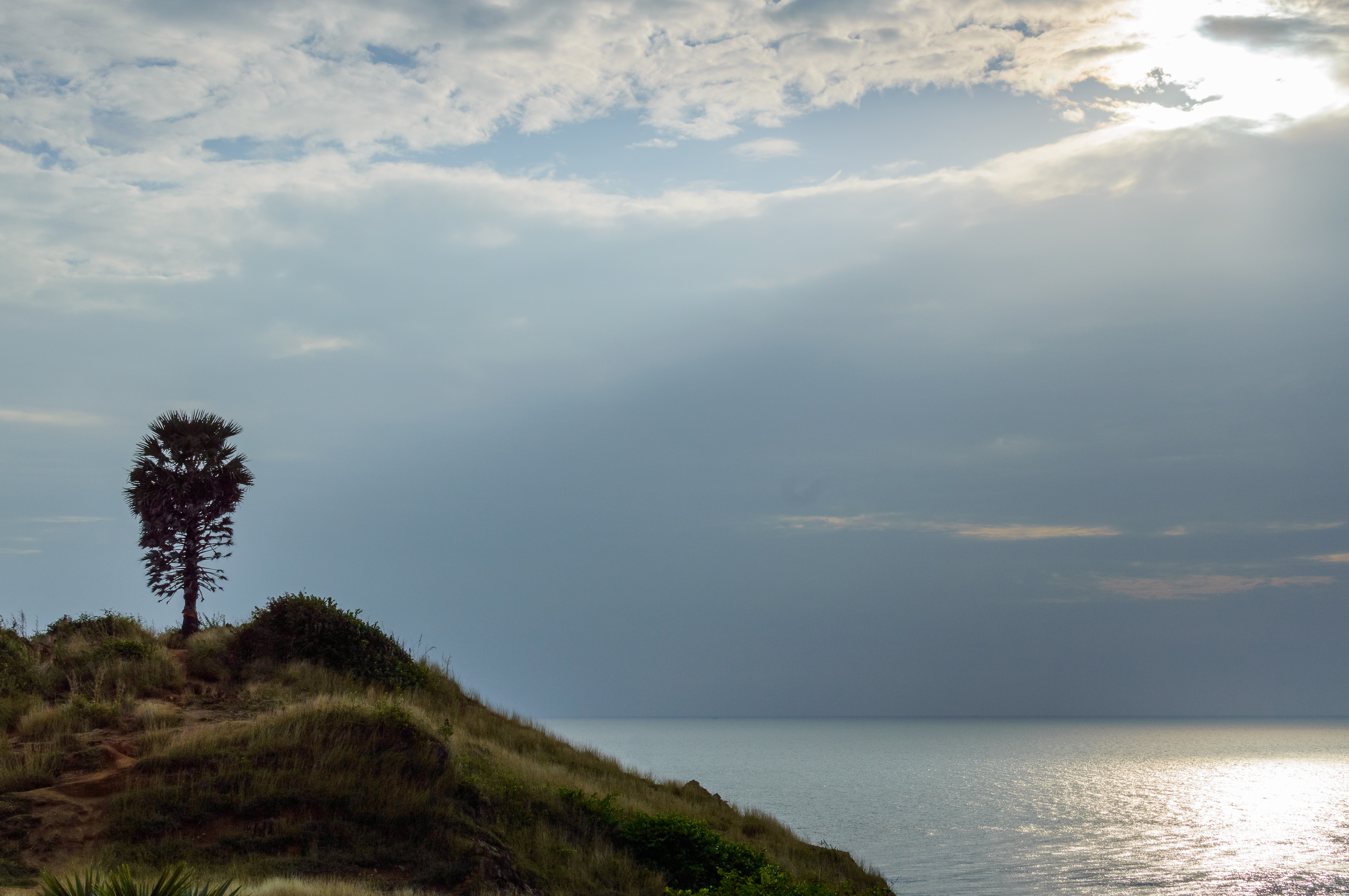 С точки зрения визуальных деталей, пальмовое дерево представляет собой резкий силуэт на фоне мягких пастельных оттенков рассвета—его листья четко очерчены за счет бокового освещения. Склон холма покрыт сухой травой и низкими кустарниками, добавляя землистые тона, которые контрастируют с холодными синими и серебристыми оттенками моря и неба. Вода мерцает под солнечным светом, раскрывая тонкие волны и отражения, что усиливает глубину. Атмосферные условия настроены спокойно, но с некоторой драматичностью; облака низко висят, рассеивая свет для создания мягкого, живописного сияния во всем кадре. Вся сцена окутана теплыми оттенками золотого часа, усиливая чувство спокойствия и вечности.