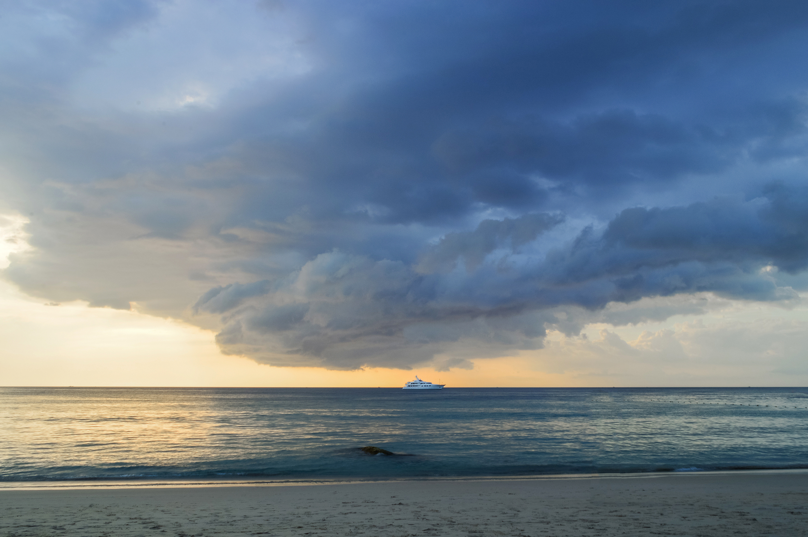 This captivating image portrays a tropical beach under the imminent threat of an approaching storm. The vast horizon is dominated by massive, dark storm clouds gathering dramatically above the ocean’s surface, while the lower portion of the sky still glows with warm golden hues from the setting sun. A solitary cruise ship sails calmly across the calm blue waters, creating a striking contrast between tranquility and impending turbulence. The foreground features a wide expanse of fine white sand where gentle waves lap at the shore, adding texture to the composition. The scene is rich in atmospheric tension — nature’s power is palpable yet serene, suggesting both beauty and unpredictability.