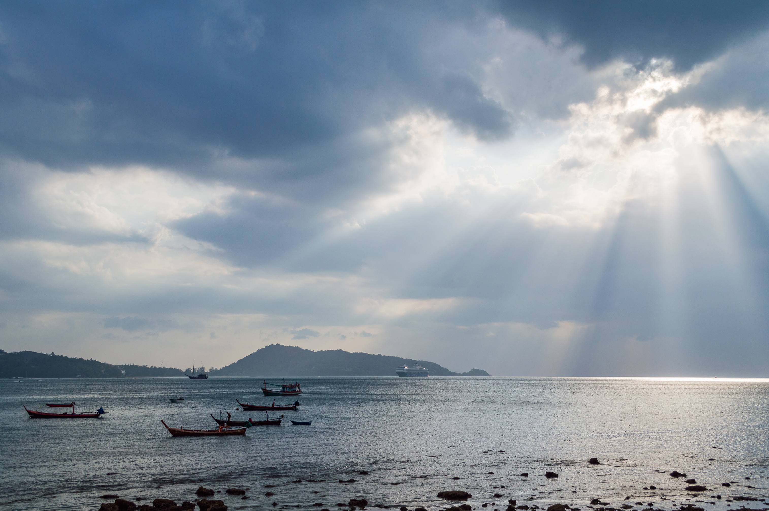 Композиционно фотография тщательно сбалансирована, представляет собой широкий угол, ведущий взгляд к горизонтальной линии, где море встречается с небом. Диагональные линии, образованные лучами света, направляют внимание по кадру, а разбросанные лодки добавляют органические формы на фоне гладкой текстуры воды. Преобладающие холодные синие тона облаков и моря контрастируют с тёплыми золотистыми акцентами от солнца, создавая богатую цветовую палитру, которая усиливает визуальную глубину. Текстуры варьируются от шероховатости камней на переднем плане до гладкого блеска воды, отражающей свет, всё это выполнено с высокой чёткостью и детализацией. Драматические облаковые формации добавляют движение и драму, контрастируя со спокойствием ниже, в то время как далёкие силуэты гор служат структурной основой для всей сцены.