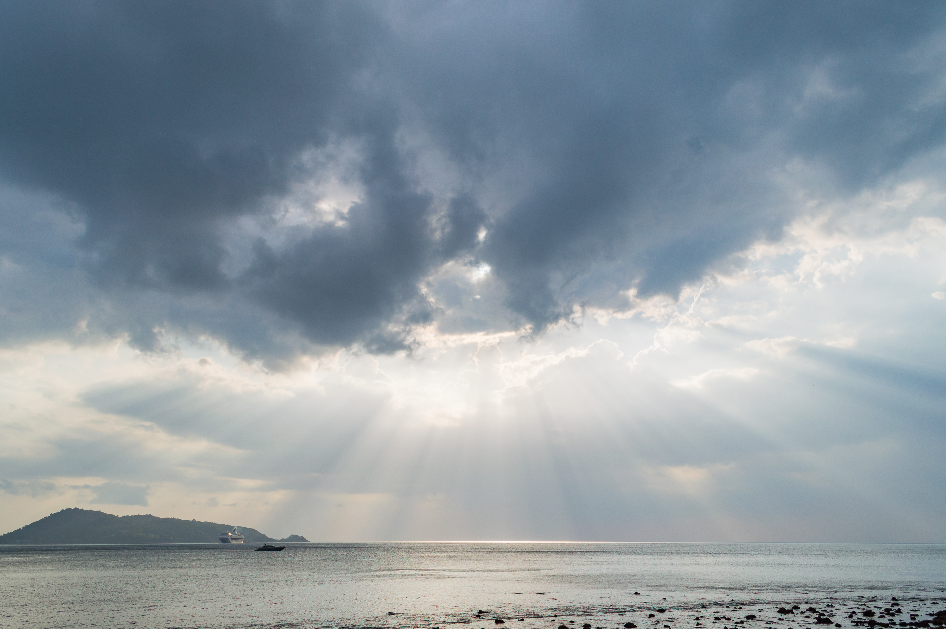Этот мощный морской пейзаж запечатлевает момент, когда лучи солнца драматически пробиваются сквозь густую крону туч, отбрасывая эфирные лучи по поверхности спокойного океана. Сцена разворачивается над обширным горизонтом, где силуэт далекого острова и маленькая лодка едва заметны — это придает композиции масштабность, подчеркивая величие природных драм. Небо доминирует с тяжелыми серыми облаками, резко контрастирующими со светящимися лучами солнца, создавая эмоционально насыщенную атмосферу надежды после бедствия. Ниже, море отражает эту напряженность — его стеклянная поверхность отражает переходные тона рассвета или заката, намекая на момент смены между штормом и спокойствием. На переднем плане каменистый берег добавляет текстуру и фиксирует взгляд зрителя, в то время как композиция использует широкоугольный объектив для усиления величия места.