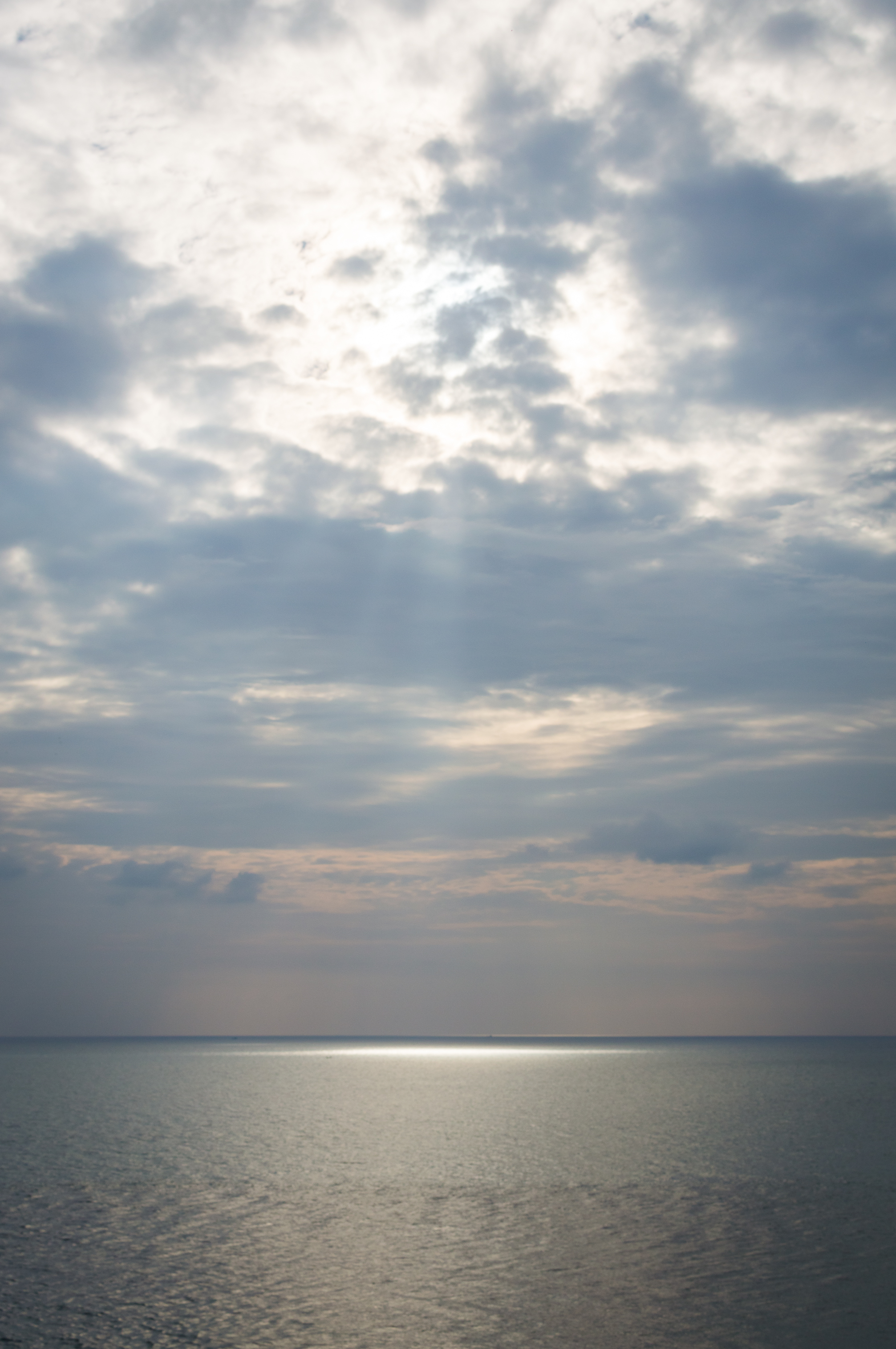 In terms of composition, the photograph utilizes a horizontal format to enhance the sense of openness and depth. The horizon line divides the frame roughly into thirds, allowing both the sky and water to be equally emphasized. The sun's beams act as natural leading lines, drawing the viewer’s eye toward the center of the image. Cloud formations are varied in texture — some fluffy and soft, others dense and dark — creating visual interest without overwhelming the scene. The colors range from cool grays and blues in the storm clouds to warmer tones near the horizon where sunlight touches the water. The surface of the ocean is smooth with gentle ripples that reflect the light, adding a shimmering effect to the composition. The absence of any human presence or man-made objects reinforces the untouched beauty of nature. Light plays a critical role: it not only illuminates but also shapes the mood, with beams creating a sense of hope and divine intervention within an otherwise overcast environment.