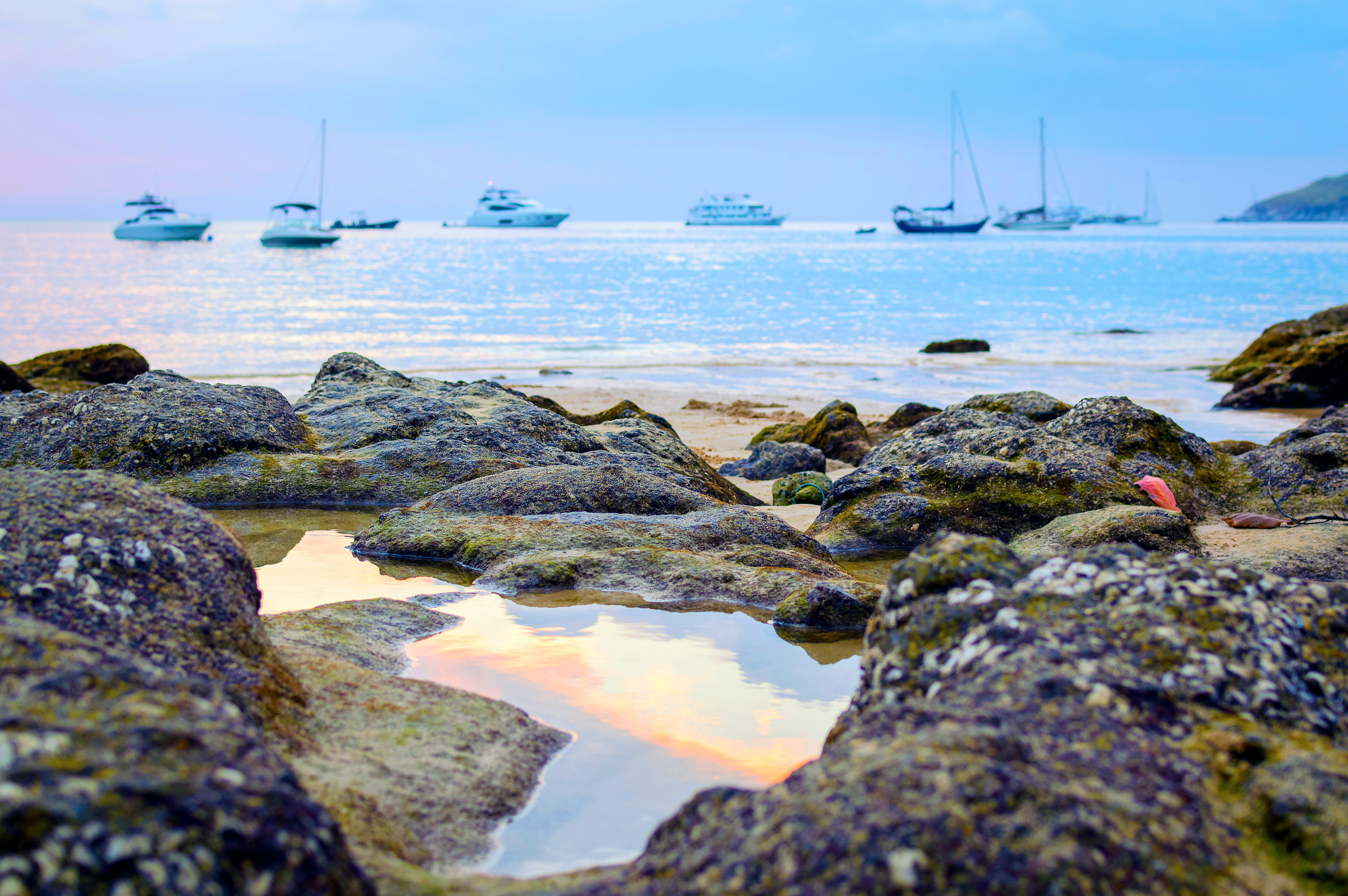 This captivating image captures the tranquil beauty of a rocky beach at sunset, where the sky transitions from soft pastel tones to deep twilight hues. Several luxury yachts and sailboats are anchored peacefully in the calm waters beyond the shoreline, creating a serene maritime scene. The foreground is dominated by rugged, moss-covered rocks that form natural pools reflecting the vibrant colors of the setting sun. These reflections add depth and symmetry to the composition, drawing attention to the interplay between land and sea. The water appears glassy and still, mirroring not only the sky but also the silhouettes of distant vessels, enhancing the sense of calm and isolation.