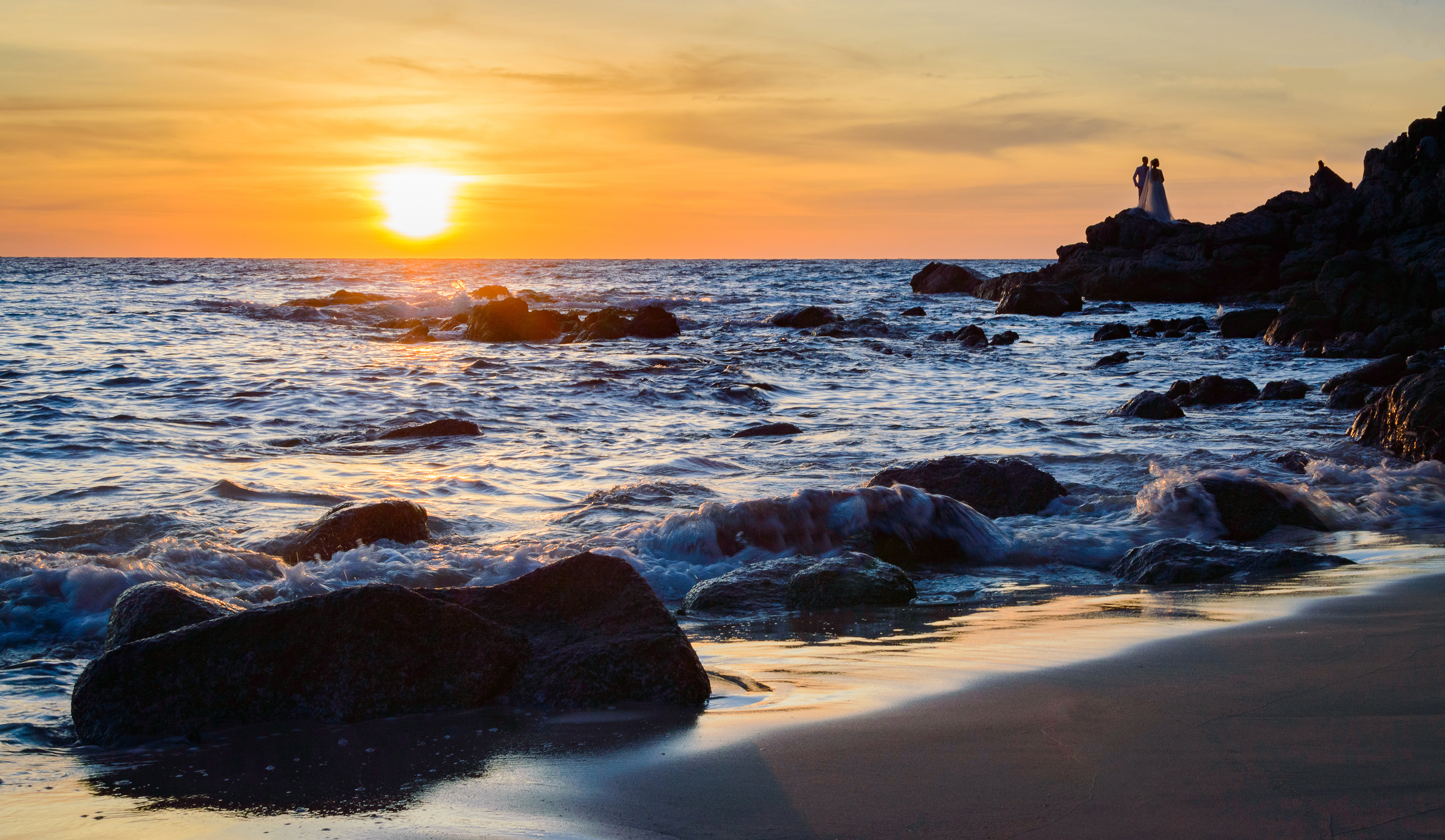Это потрясающее фото запечатлело романтическую пару, стоящую на скалистом побережье во время золотого часа заката. Сцена разворачивается над обширным океаном, где мягкие волны бьются о тёмные, текстурированные валуны, создавая динамичную белую пену, контрастирующую с глубоким голубым и изумрудными водами. Над ними небо переходит от ярко-оранжевого к мягкому жёлтому у горизонта, плавно смешиваясь с тусклыми фиолетовыми и синими оттенками выше. Низкое солнце бросает длинные тени и освещает силуэт пары, делая их похожими на трепетный момент в величии природы.